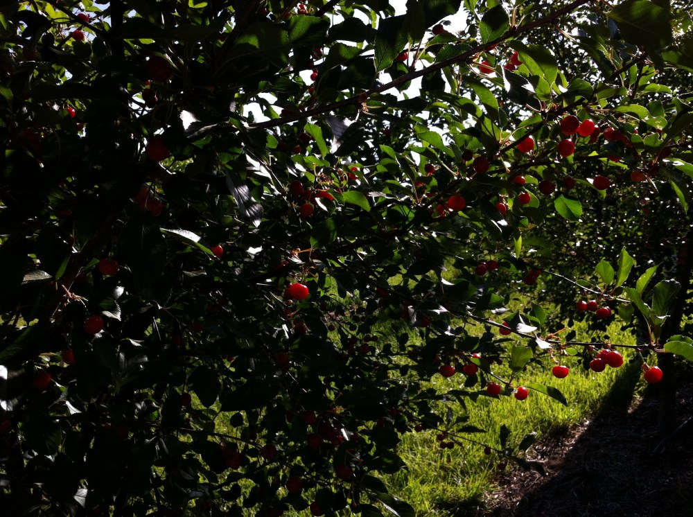 The season of Cherries is upon us! These trees are in my friends’ expansive organic AND biodynamic orchard in Paonia, Colorado – in the fruit grower’s valley, THE fruit grower’s valley of the state. I have an Italian plum, small “summer” apple, a big grape bower with Reliance and Thompson seedless grapes, a small strawberry bed, scraggly raspberry bush, and a towering bonanza of elderberry bushes. Here and now, it’s cherries: