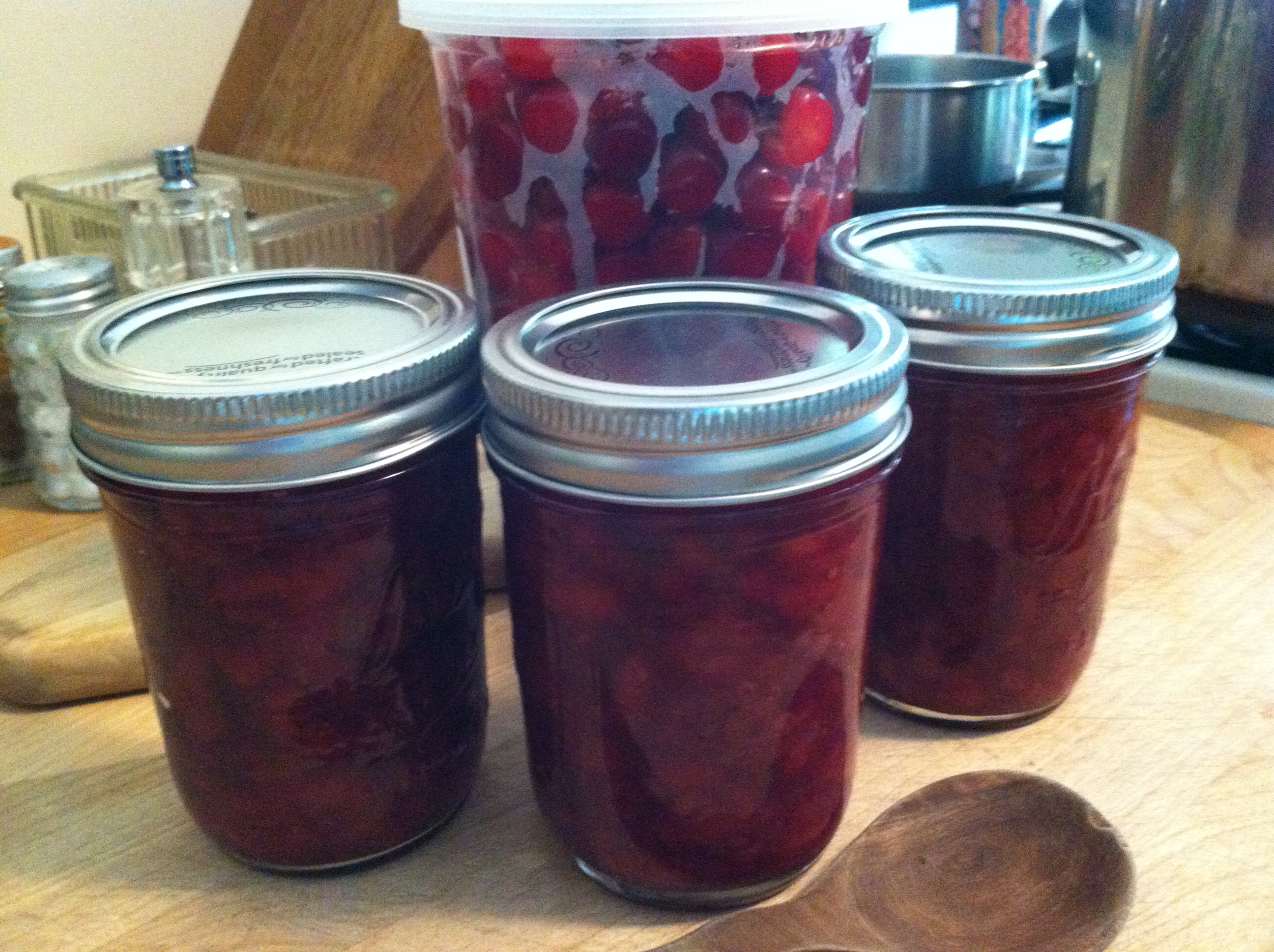 Cherry jam is a treasure too, on winter holidays and anytime in between. I made this batch with about 10 cups whole pitted cherries simmered over medium heat until they collapsed into themselves, along with about a cup of organic sugar and a half cup local honey until the juice thickened, then ladled into sterilized jars and admired as the jam gleamed in the sun.