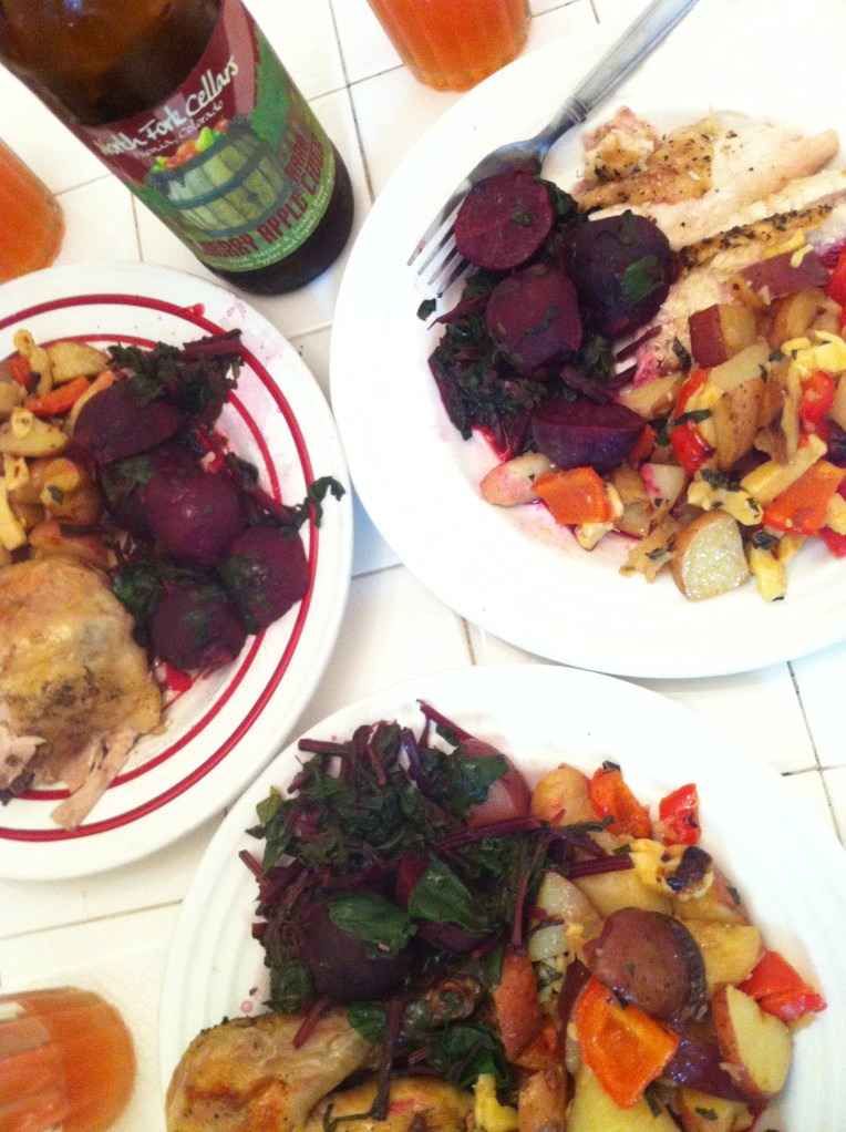 Our first feast prepared together for the Moving In celebration looked like this. We toasted with a local Paonia sour cherry and apple hard cider from North Fork Cellars out of Delicious Orchards. Loved the cherry essence! Then we ate local (from my garden and Paonia) and from the Front Range. We roasted a Boulder Natural chicken, rubbed with salt, pepper, thyme, basil, rosemary, stone ground mustard, with a few bay leaves and garlic cloves tucked inside. Made a fantastic roast potato, red pepper and onion salad with chopped Irish “Dubliner” cheese, fresh basil with a few splashes of balsamic vinegar and olive oil to go with it, and tender beets with their greens, steamed and tossed with plenty of butter, fresh oregano, salt and pepper…