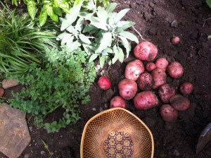 today’s harvest of red pontiac heirloom potatoes alongside white sage, oregano, sweet grass and basil plants Posted by Margaret Gilfoyle on July 31, 2012