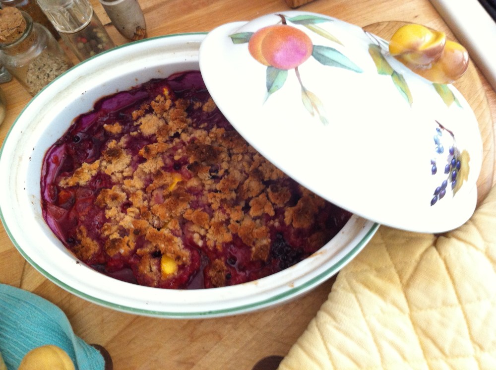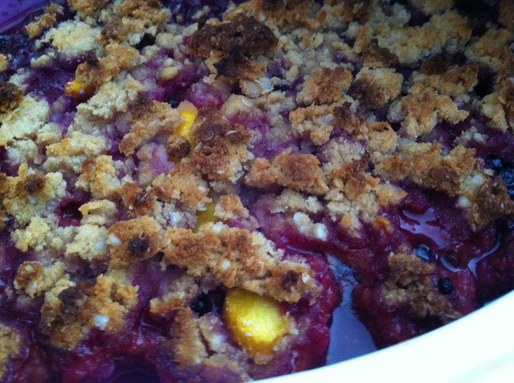 In a small bowl, with a fork or your fingers, evenly rub the topping ingredients into a crumbly topping. Add a little more flour or butter for the consistency you like, taste. Will you like it a bit sweeter? A drizzle more honey, then. Crumble topping evenly over the top of the fruit filling. Place on center rack of preheated oven, and bake 50 minutes to around 1 hour. Note: bake uncovered the first half or so of the baking time. Check about 1/2 way through your baking time to see how the topping is browning, and cover if necessary, with a loose piece of foil or other cover. It was delicious and fully devoured at the potluck that night.