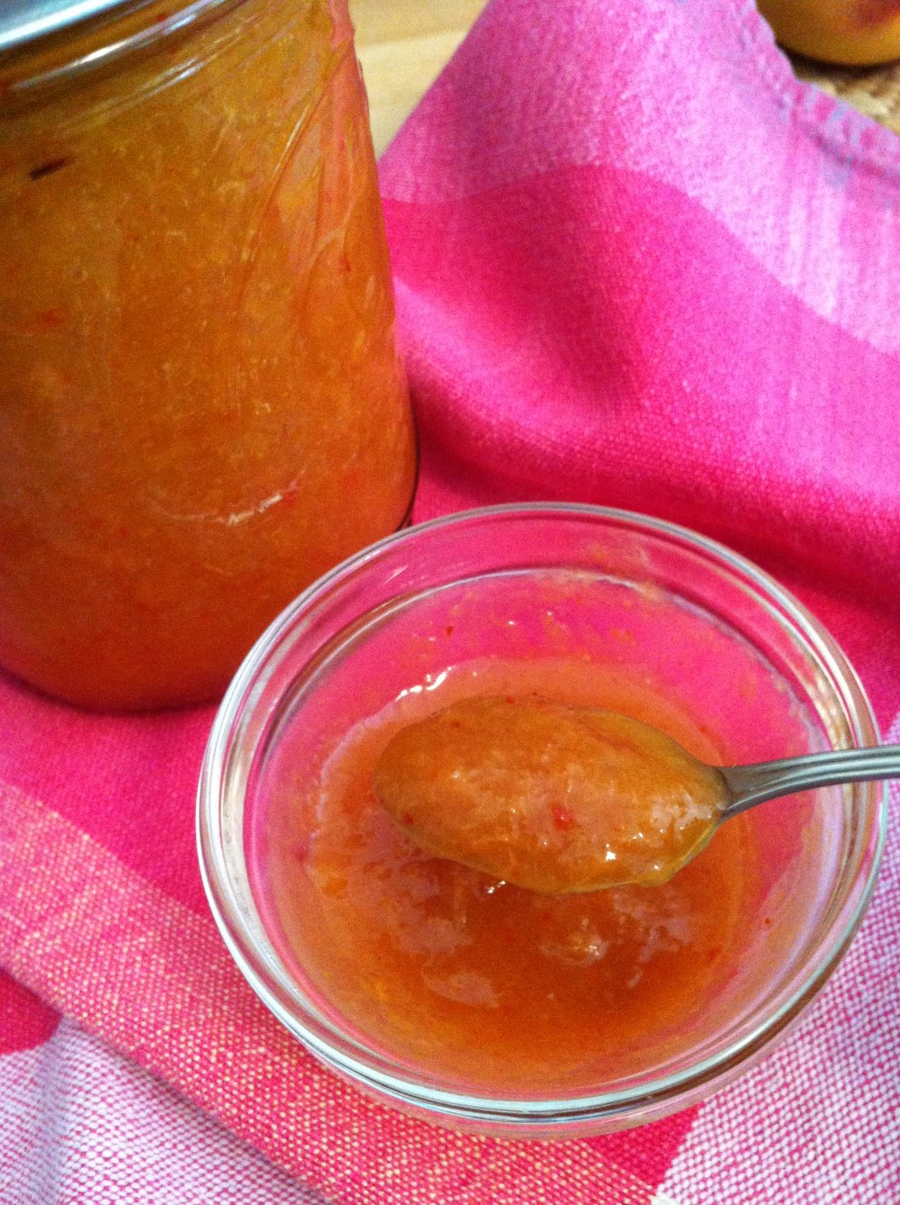 I had three peaches left over after my other projects, and was going out of town with 42 more pounds of peaches the next morning. What to do? I thought it would be fun to make something, rather than just devour them (as I’d put away a few already. They were just so good.) Hot sauce is always fantastic, and I had three little red, roasted serrano chilies just waiting. Excellent dip for chips or sweet potato fries, tacos, burritos, black beans, (and southwest poultry and pork dishes – if you eat meat)