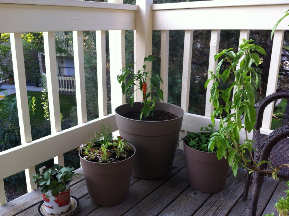 As I mentioned last month, my son and daughter in law just moved to their new place in Denver, a second story condo in a really lovely condominium complex, with walking trails, ponds, trees, a little creek and lots of welcome for canine companions – perfect for them. They miss having a yard, but it is working out really well with all the walks everybody gets to go on. But what about a garden? This past weekend we made a start. Pots, dirt, plants, and an imagination for more. Even on a budget, the heart ravenous to grow can be satiated with a few seedlings. At least this fall.