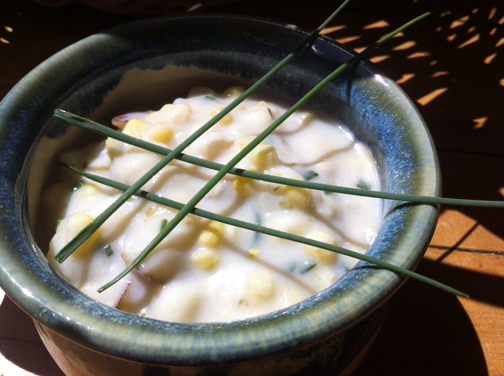 Into the boiling corn cob stock (minus the cobs!) add the potatoes. Boil 15-20 minutes, add corn, continuing to boil. Reduce heat to medium, pour in cream or milk, add chives and seasonings. Stir, then allow the soup to simmer until potatoes are very soft and corn is tender, about 20-25 minutes more. Puree about 1/3 of the soup in a blender or food processor. Add back into soup on the stove, blend well, taste, adjust seasonings if you like, and serve.