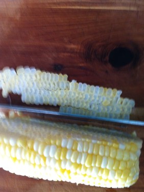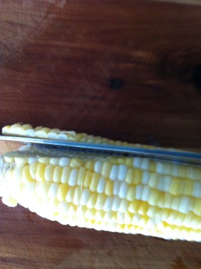 I offer for you today three variations on corn, just in time for Labor Day weekend get togethers. Do hope you enjoy! They all involve cutting the kernels from the cobs. Here is my method in a few pictures. Nice because the kernels don’t fly all over the kitchen… unless you need a few giggles, and a bunch more clean up, try this.