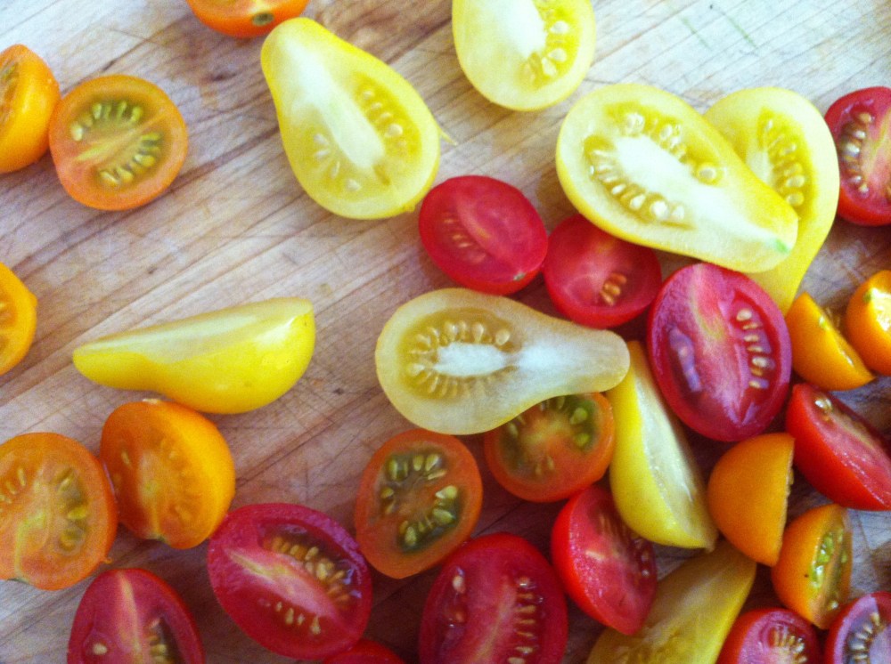 - 1 1/2 c. fresh cherry tomatoes – a mixture is nice if available, such as yellow pear, sun gold, moby grape, sweet 100’s, black cherry, etc.