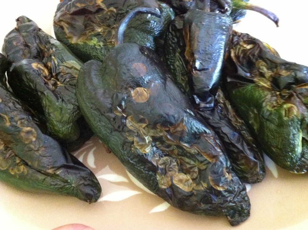 - 6 large poblano or pasilla chili peppers, roasted, skinned and seeded