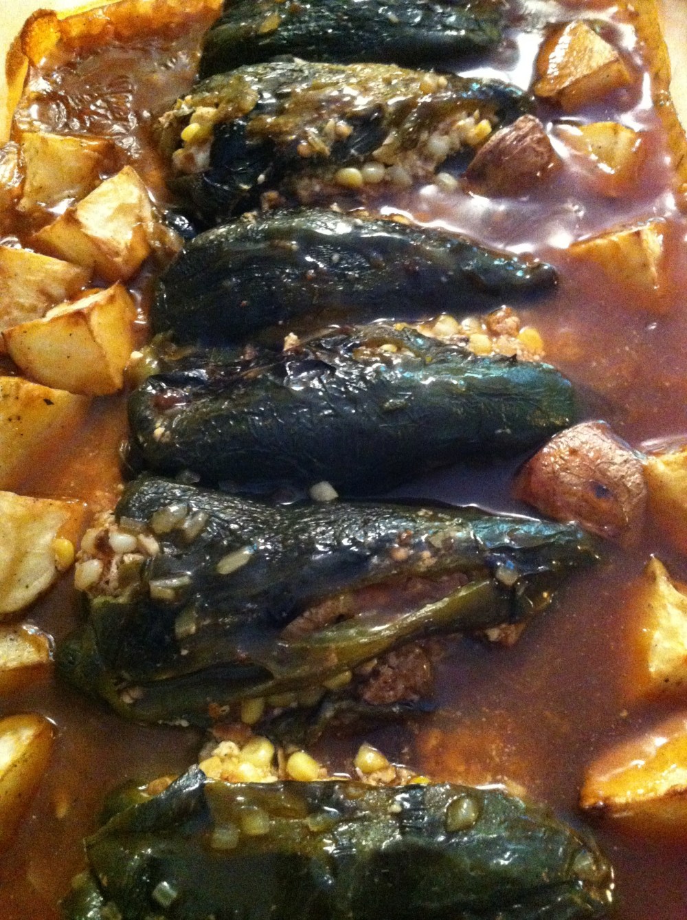 Arrange stuffed peppers in pan with par-roasted potatoes. Ladle gravy over peppers and potatoes, cover, and bake an additional 20 minutes.
