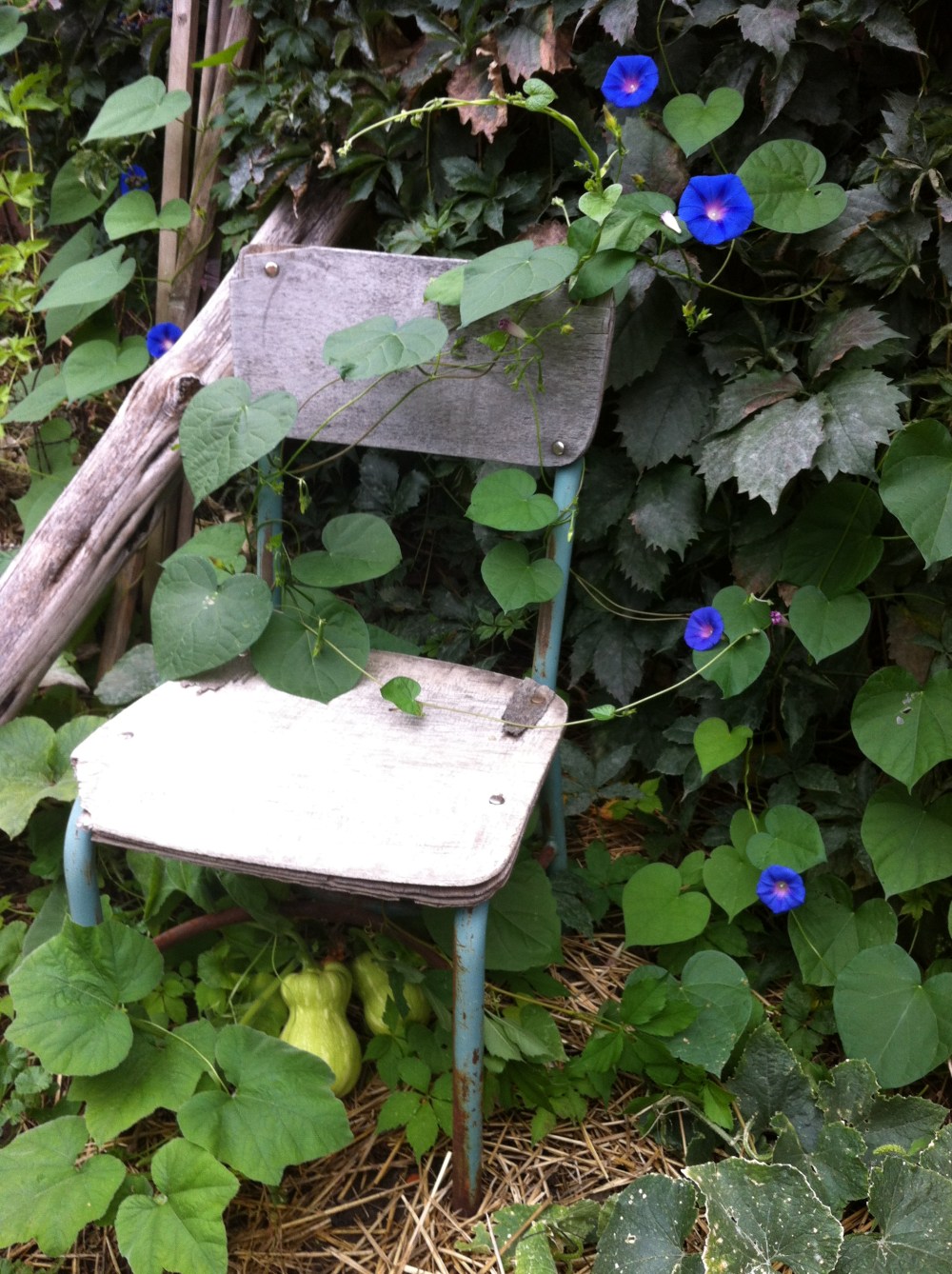 Well, what next? I fairly catapaulted myself towards the garden – for, admittedly, a bit of solace, and, both feet on the ground whilst my heart was spinning, I looked down. Moved a couple of leaves. Underneath my garden chair I found a surprise: