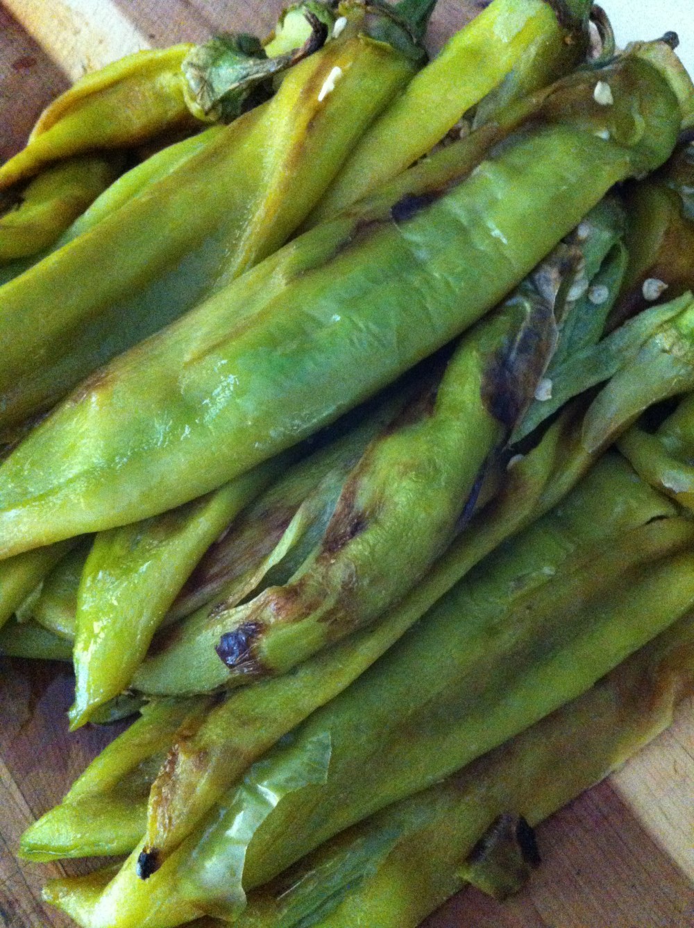 I picked up a sack of chilies at the farmer’s market today, and roasted them myself at home. The heady scent of roasting chilies in the house is nearly as wonderful as eating them, fiery seeds and all.