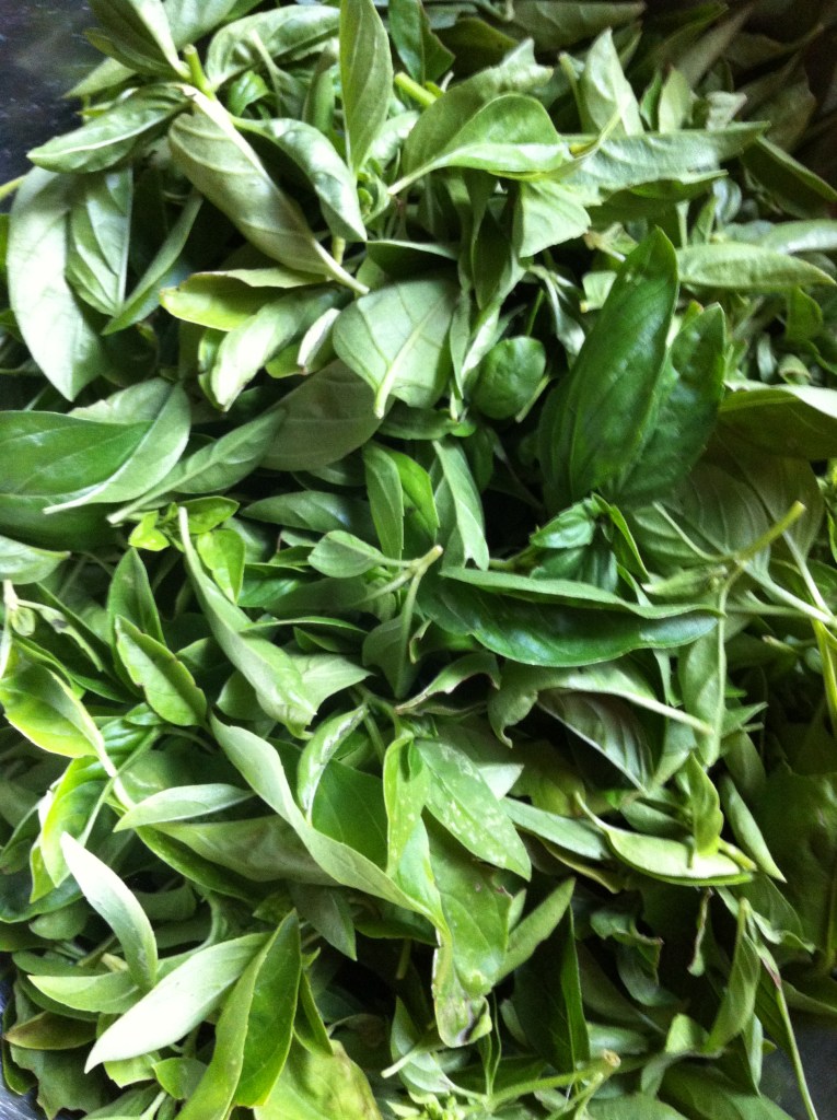 I made pesto with walnuts and walnut oil, parmesan, garlic, salt, and all this glorious basil. Some will be dabbed atop japonica rice pancakes, some no doubt with pasta, a tangy scattering of my dried tomatoes, and chevre… I’m keeping the stems which grew so sturdily they appear to have a thin brown bark. Thinking they will add a sweet rich scent to a fire this fall in the chimenea.