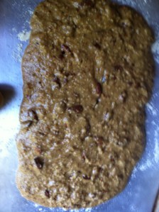Preheat oven to 375. combine dry ingredients in a mixing bowl. Add the last four ingredients and whisk until well blended. Lightly flour a heavy baking sheet. Pour and shape dough into long rectangle. Bake 20 minutes on middle rack of the oven, or firm in the center. Remove from oven and cool 5 minutes, reducing oven heat to 300. Cut the log with a sharp knife into 1/2 – 3/4 inch slices. (*Note: I choose to use a fresh baking sheet for the second round in the oven to reduce any possibility of burning crumbs from the first baking.) Place biscotti cut side up on baking sheet, and bake a second time for about 25 minutes, or until biscotti are dry in the center.