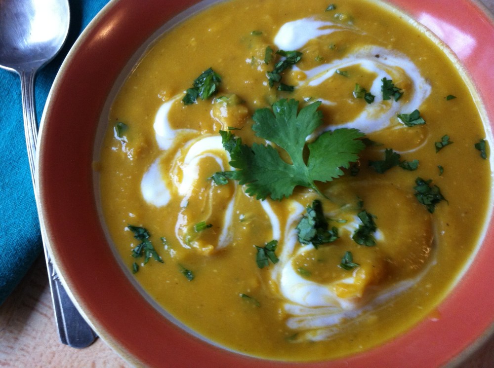 Tonight the theme is Indian. I had weeks to decide, but it finally came together yesterday. Using vegetables from the 2012 garden, I’ll be making Pumpkin Dal, a smooth, delicious Indian soup with yellow split peas (red lentils), pumpkin, coconut and spices. There are thousands of recipes for dal, known in every region of India from the Himalayas in the north to the tropical shores of the south. It’s the name for any legume dish, every dried pea, bean or lentil. I was thrilled to find a pumpkin dal in the wonderful India, the Vegetarian Table cookbook by Yumana Devi, so I could make use of one of my sweet pumpkins from this year’s garden. I’m also putting together Punjabi Pan Fried Green (and yellow wax plus burgundy) Beans, an interesting dish with spicy garbanzo accents – perhaps I’ll feature that recipe in another post.