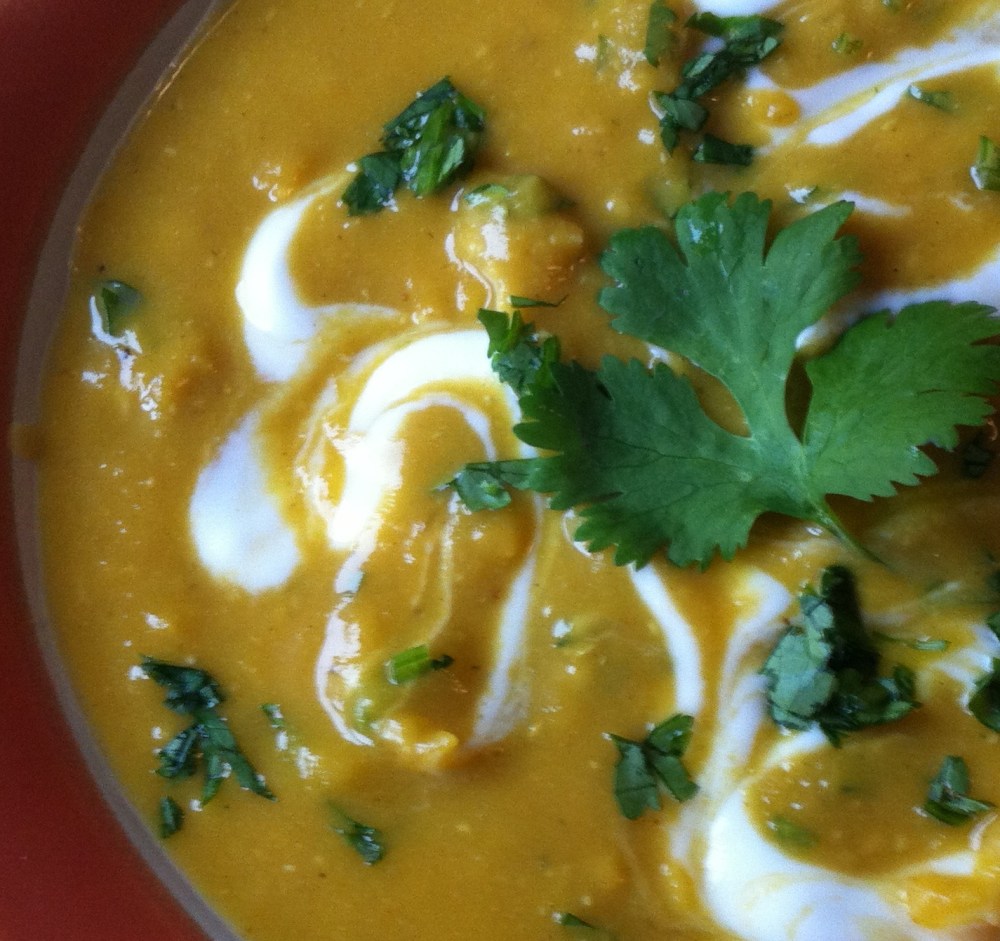 Rinse split peas (dal) in a colander. Pour into large pot along with alll the ingredients down to water. Then pour fresh water to cover plus about 3 inches above dal in pot. Bring to low boil, and cook, stirring often, until the dal is very tender, about 45 minutes. Check during cooking time and add water as necessary. Add pumpkin, ginger, chilies, garam masala, honey and coconut, continue simmering until coconut is tender. Puree in batches in food processor or blender, return to clean pot. Turn heat to low, add 1 tbsp of the ghee or butter, and whisk, adding water to a nice soup consistency if necessary. Just before serving, roast the cumin seed in a separate dry small skillet until the seeds begin to pop, then add remaining ghee and chopped cilantro, warm herbs in the ghee, then swirl into the dal. Serve hot with yogurt if desired.