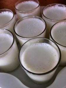 Milk and yogurt starter poured into glasses and set into heated fermenter Posted by Margaret Gilfoyle on January 6, 2013