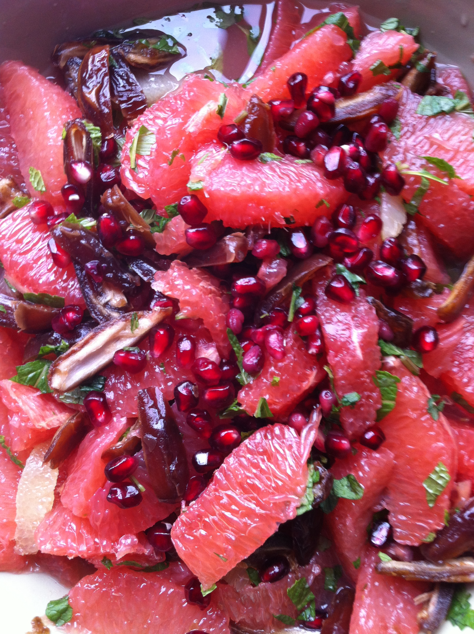 Segment grapefruit and lemon with a sharp knife. Sliver dates. Scatter pomegranate seeds. Chop mint. Drizzle honey. Toss.