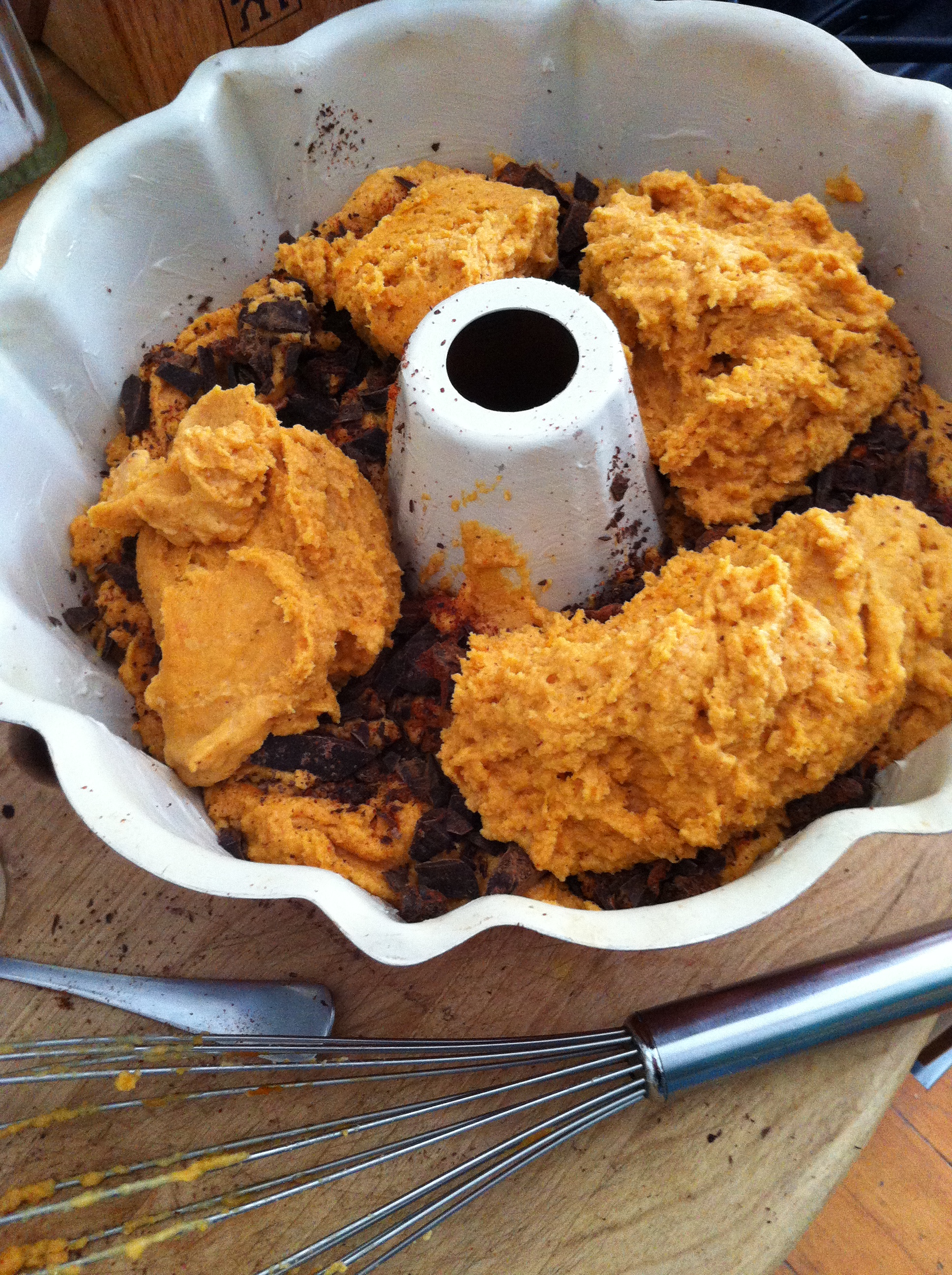 Scoop/spread a little over half the batter into well buttered bundt pan. Cover with the chocolate fruit filling, pressing filling into center of the ring of batter. Spread remaining batter over the top. Bake in a 350 degree oven for about 40-45 minutes, until center is firm and cake is lightly browned. Wait a minute or two, then turn out onto cooling rack. Cool, then, if you have the will power, before slicing. Excellent straight up, or embellished with honey sweetened yogurt or whipped cream. Pumpkin or cinnamon ice cream would likely take this one straight over the top.