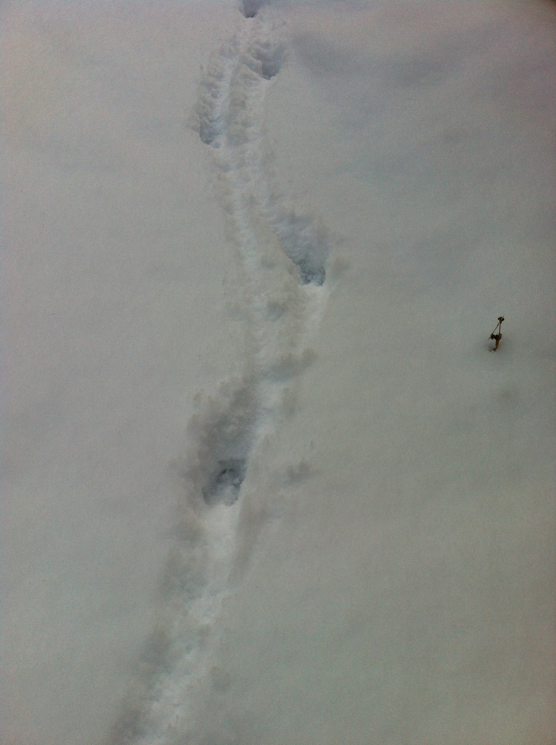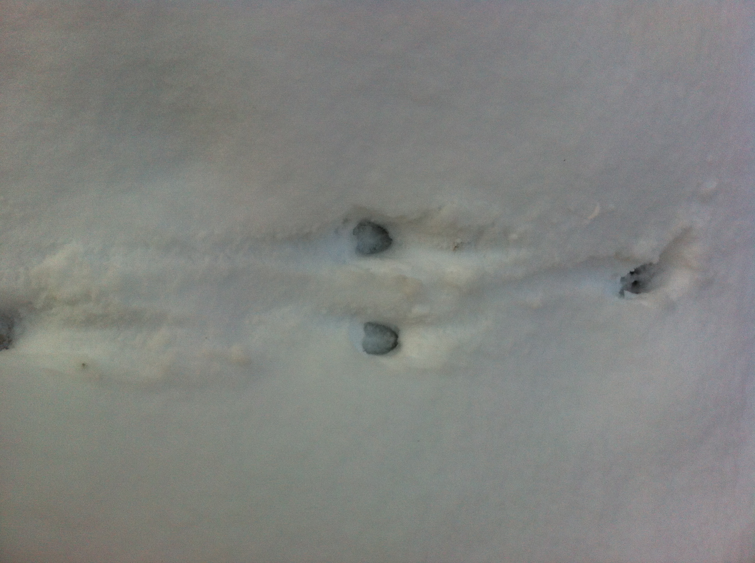 A few days ago I woke up to six more inches of snow and surprise tracks at the back door. I could see them from the kitchen. I live right in town, and a small town at that. It takes about 2 minutes to get to the country, and even from my back yard I can turn east and see Lamborn mountain, covered with snow. But even so, large four legged visitors are not that common jumping fences and strolling up to my back door, walking to the grape bower and sniffing out last fall’s fallen grapes, making figure eights in the side lawn before leaving again.