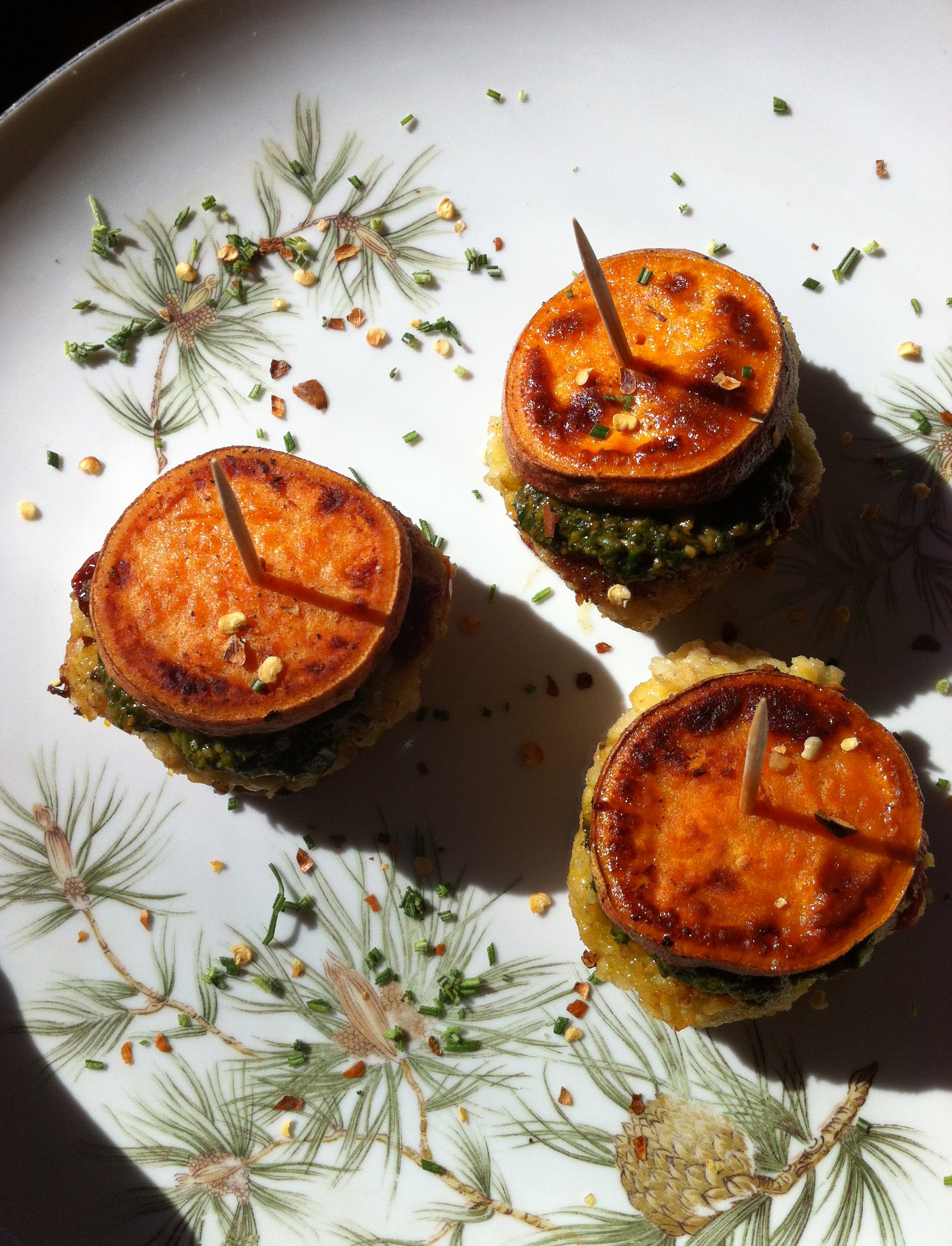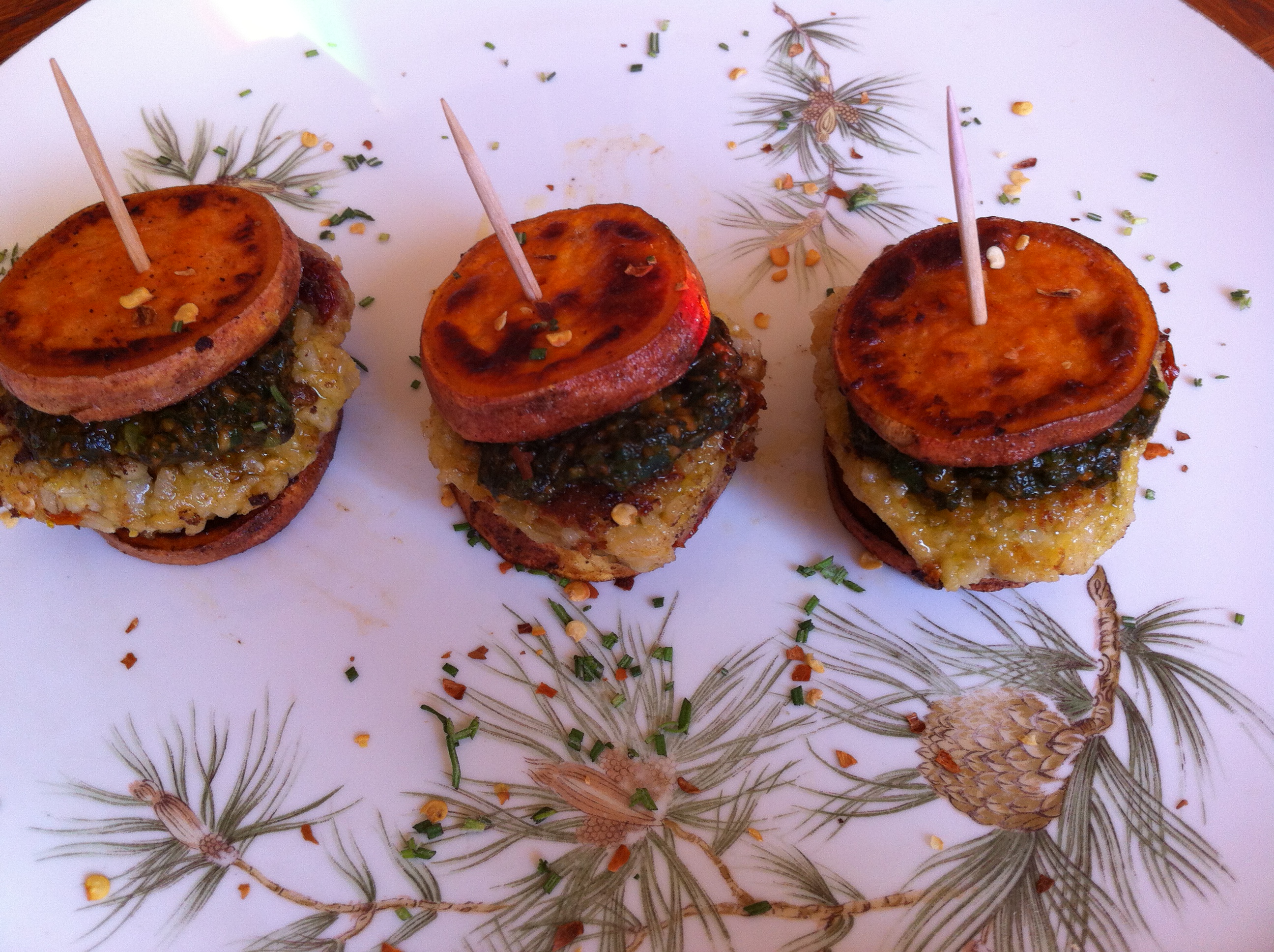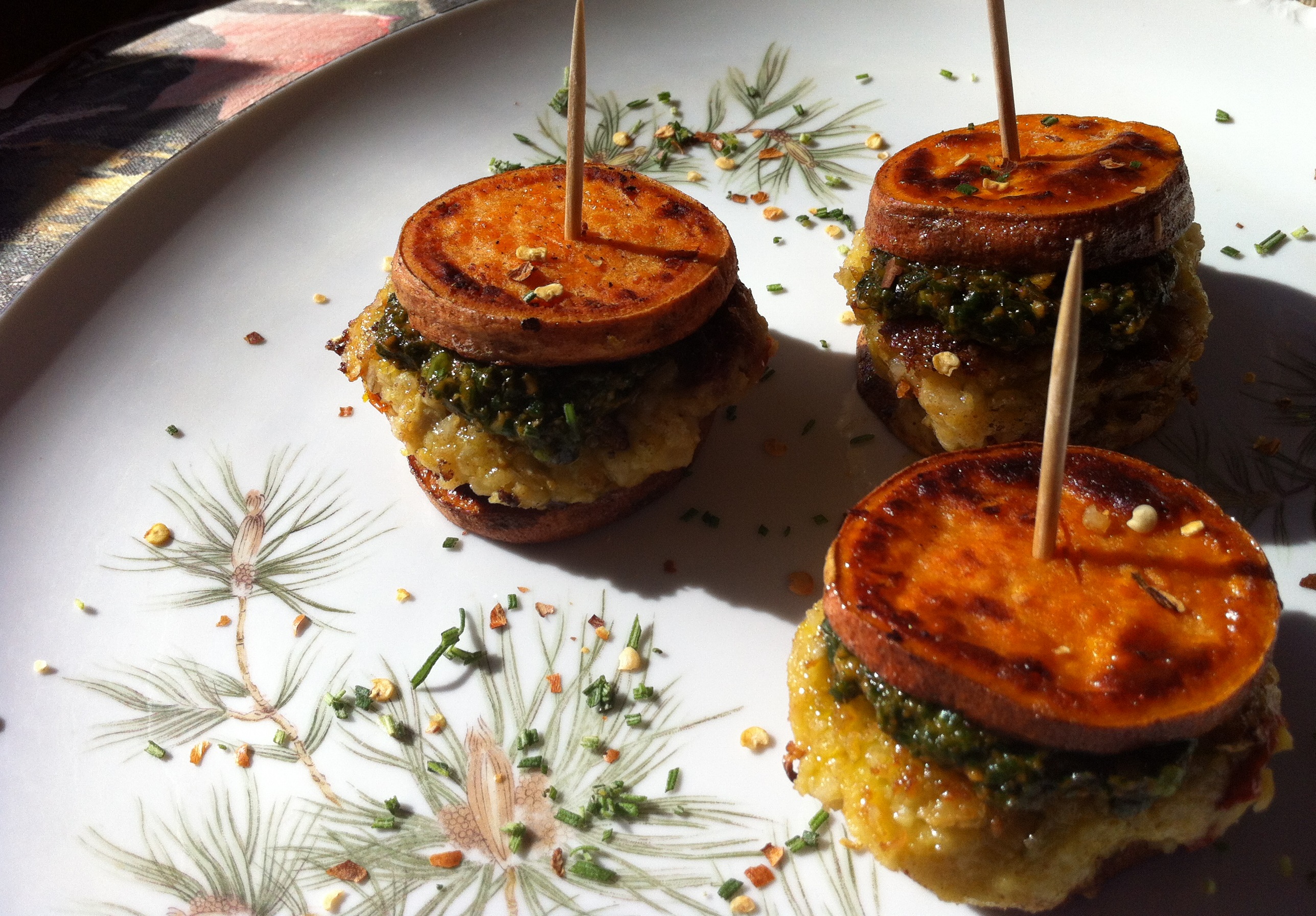 Garbanzo Artichoke Sliders with Sundried Tomatoes, Lemon Basil Pesto and Sweet Potato “Buns”