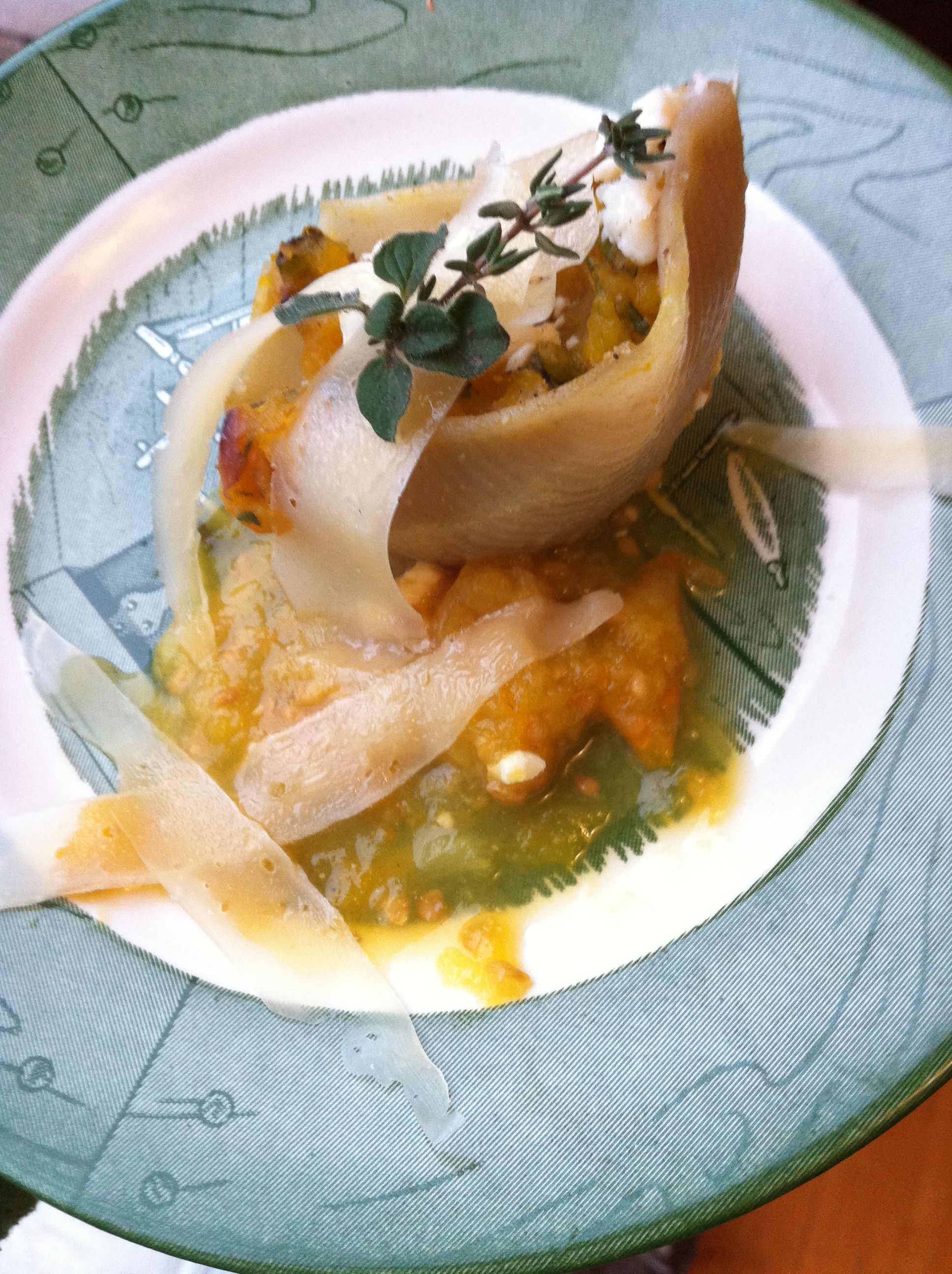 Roasted butternut squash – I even remember WHICH squash this was in the garden. It had a sweet, kind of – squashed – shape on the stem end, and had popped up unexpectedly late in the season underneath my garden chair. Want to see it on the vine?