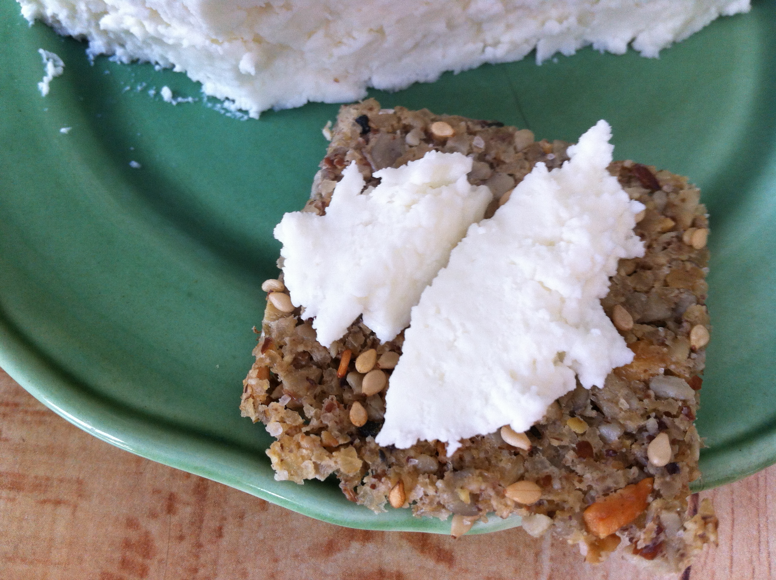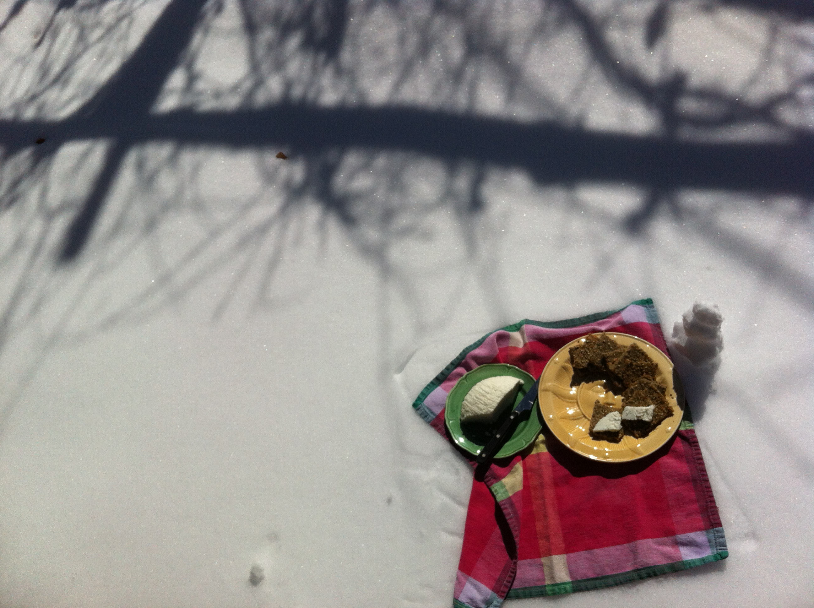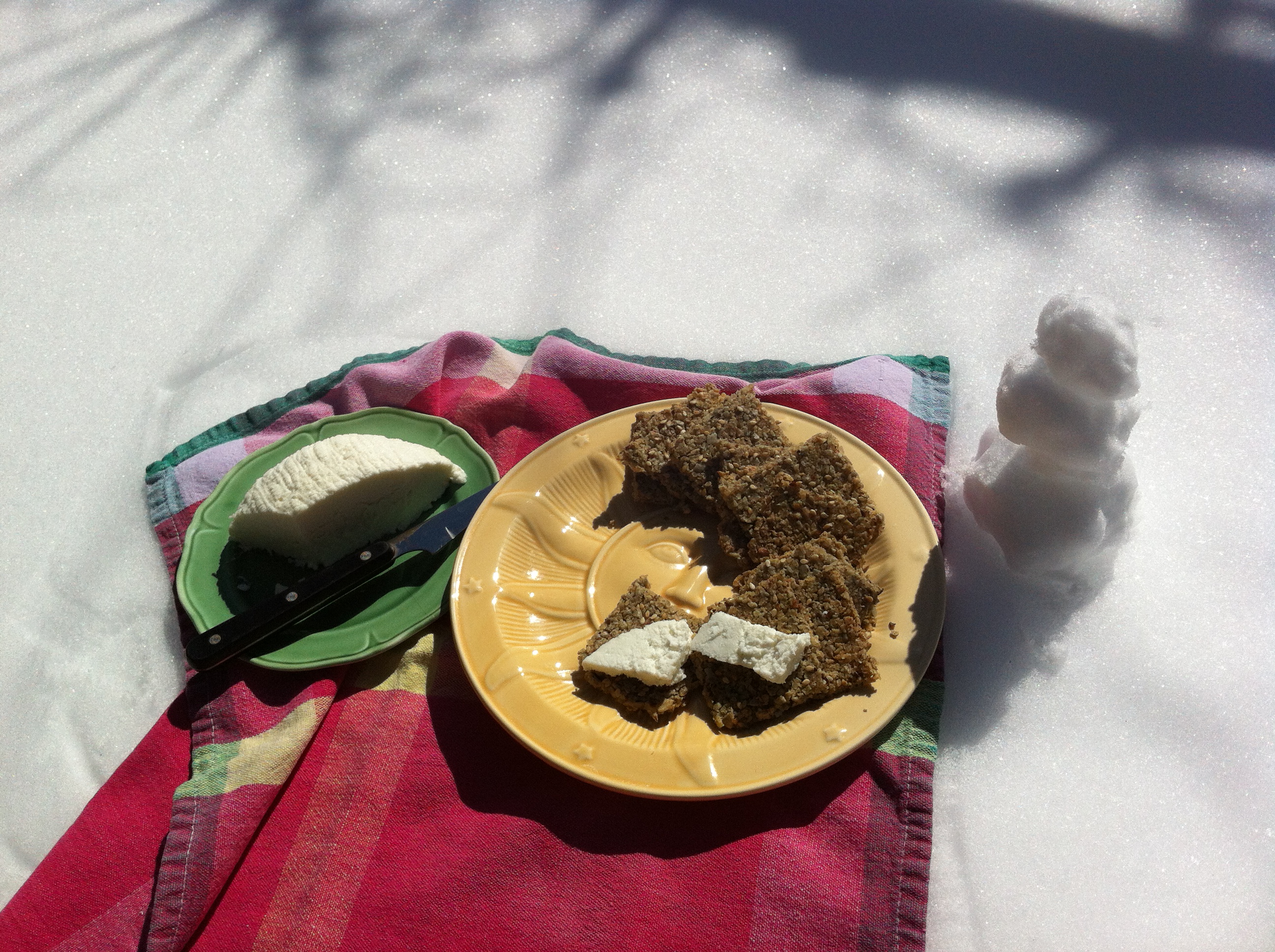 So for now, let’s eat! Are you hungry? Fresh cheese and just made crackers with herbs from the garden. With the snow drifts for our table.