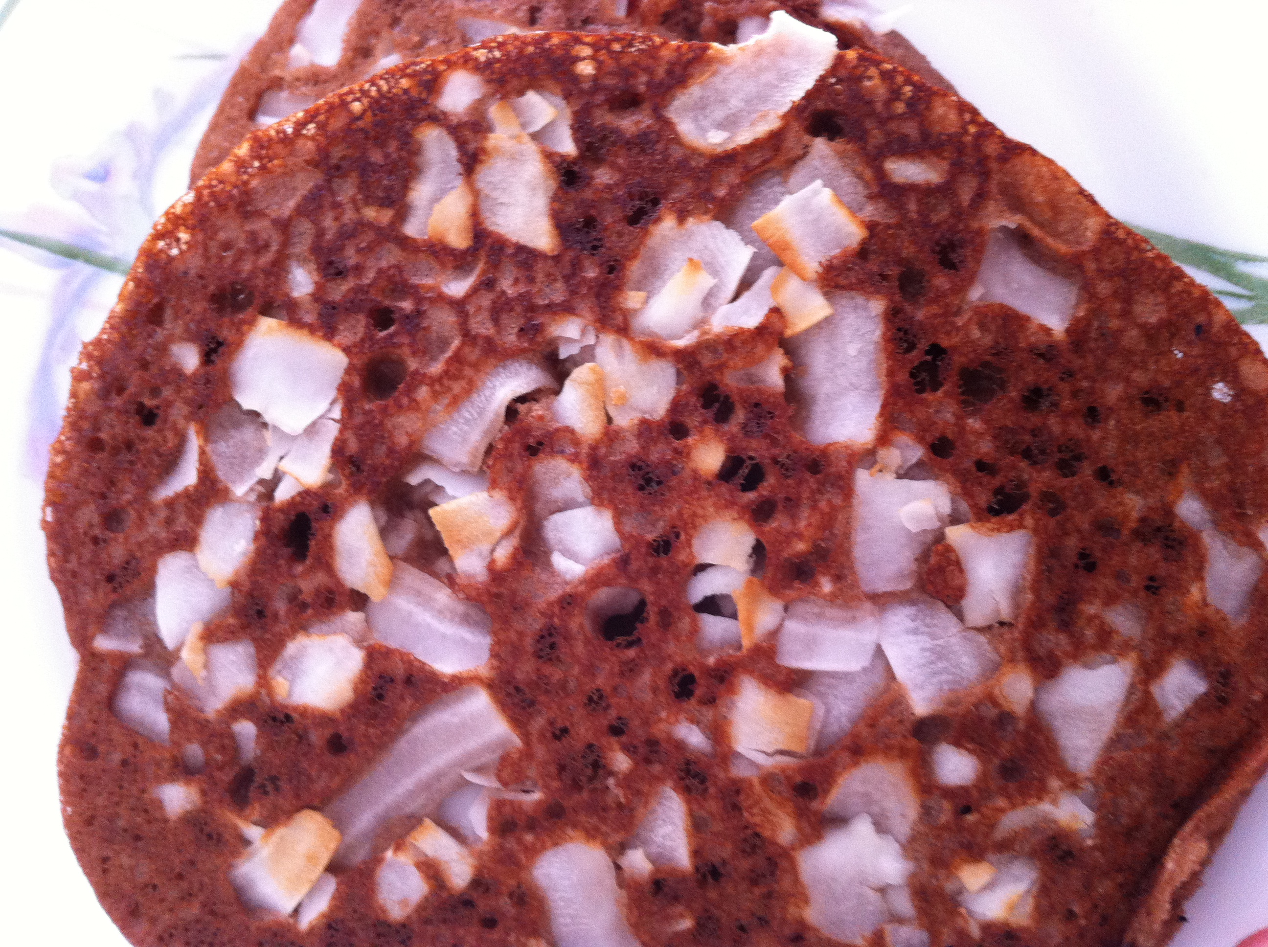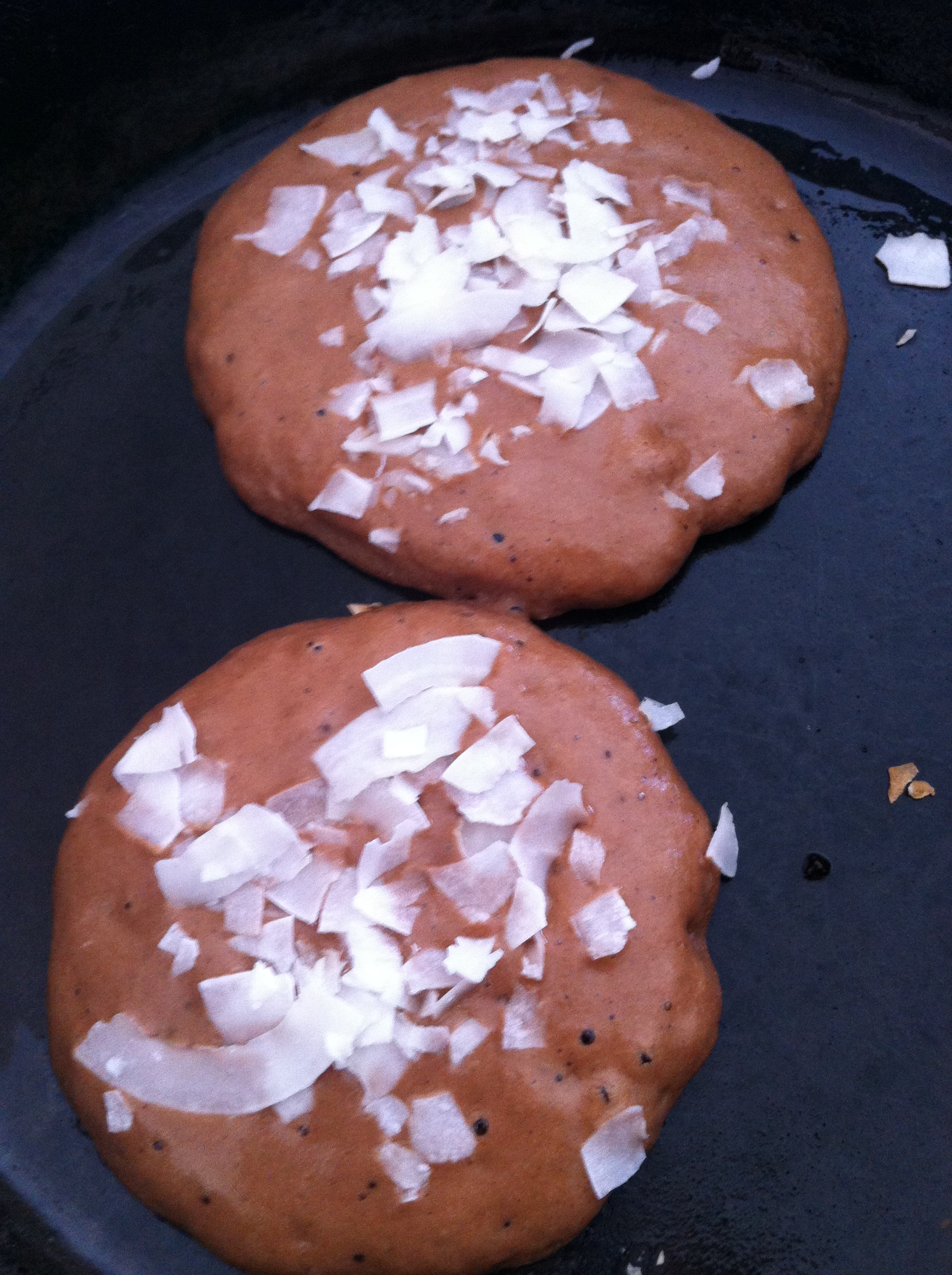 - organic flaked coconut, (unsweetened) approximately 1 tbsp. per pancake