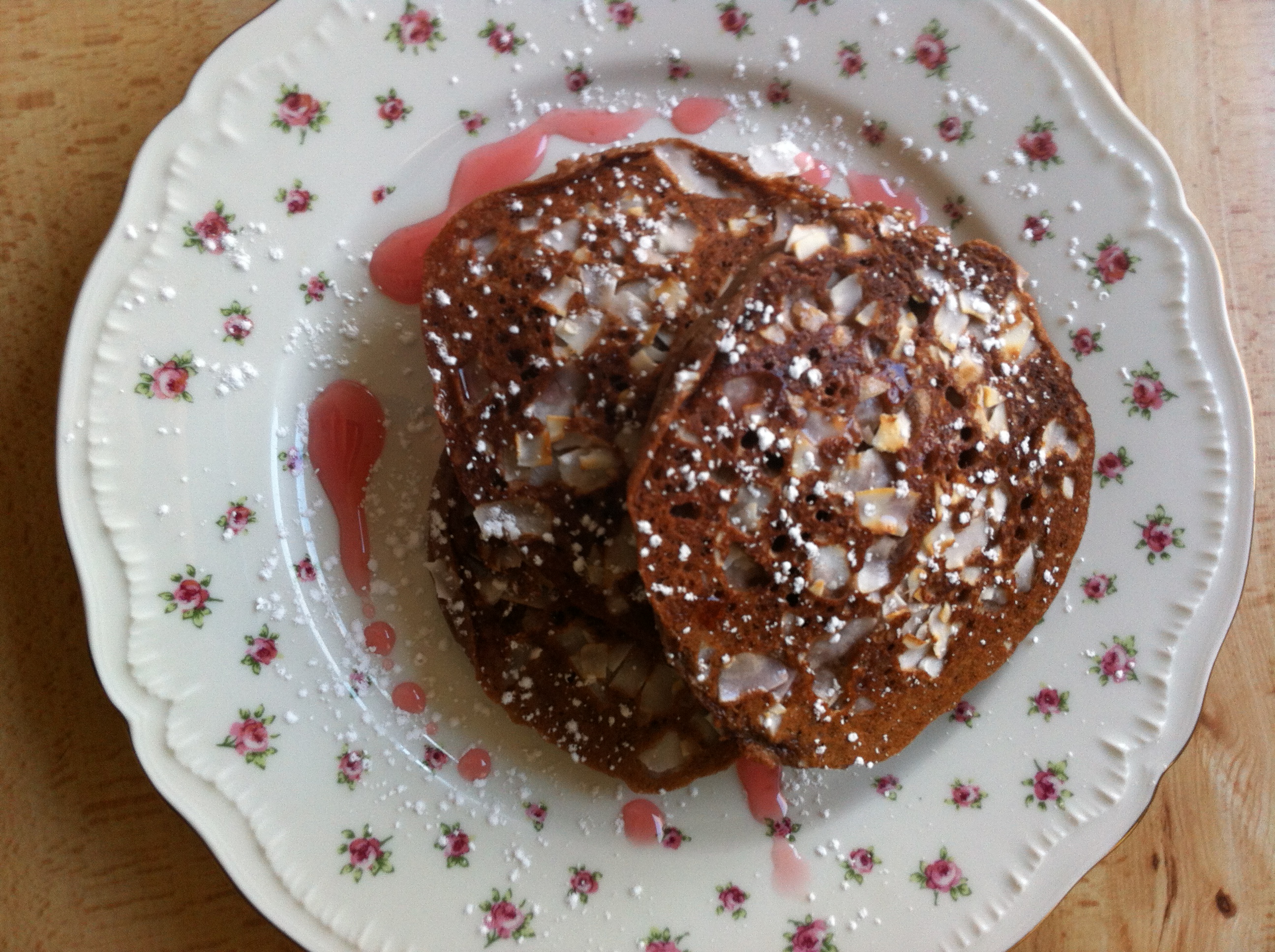 Assemble and whisk together dry ingredients. Oil and heat cast iron or other non-stick skillet over medium low heat. Whisk liquid ingredients into the dry, making a pourable chocolate batter. Pour batter into skillet, forming small pancakes about 3 inches across. Scatter the top of each pancake with about one tablespoon of dried coconut. When large bubbles form around edges, gently flip with a thin, wide spatula, and cook a couple of minutes more. Keep warm until all of your pancakes are made. Serve with a dusting of powdered sugar and “cherry honey”, or with your favorite toppings.