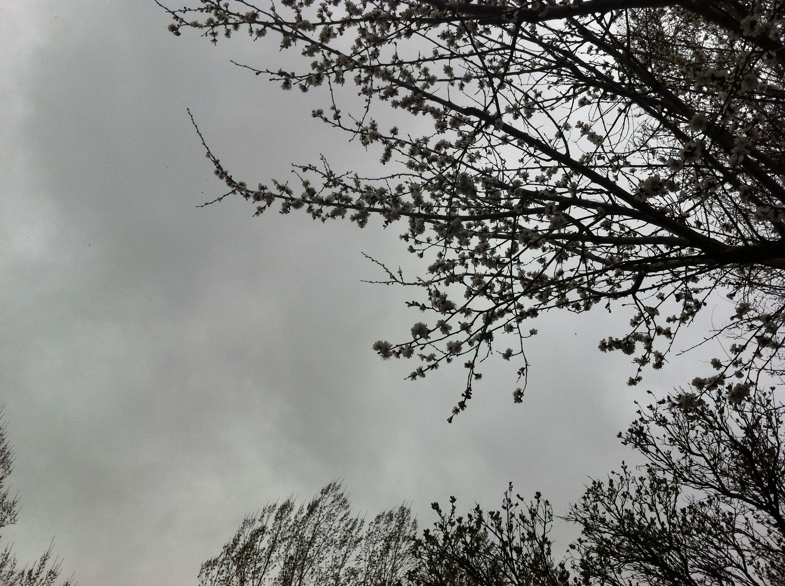 A few petals break loose from the apricot blossoms, scattering through the wind against the incoming rain.