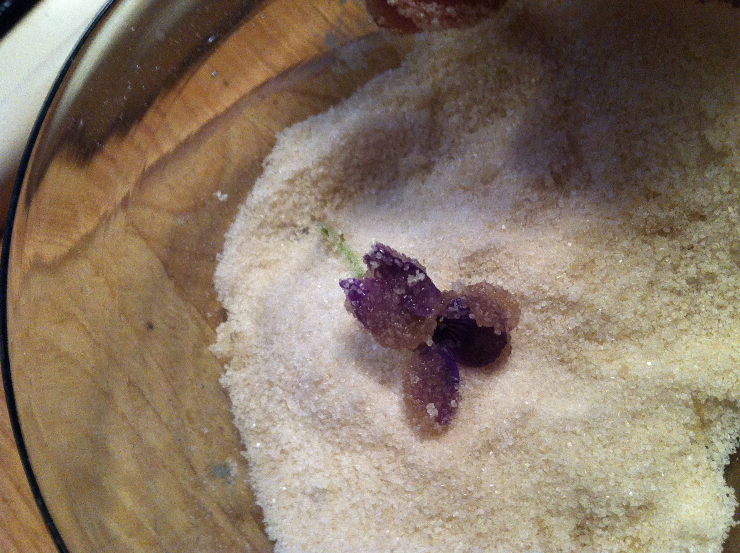 Gently dredge, and/or sprinkle the violet with organic sugar. I pulsed the sugar in the food processor to achieve a finer grained sugar. Posted by Margaret Gilfoyle on April 6, 2013