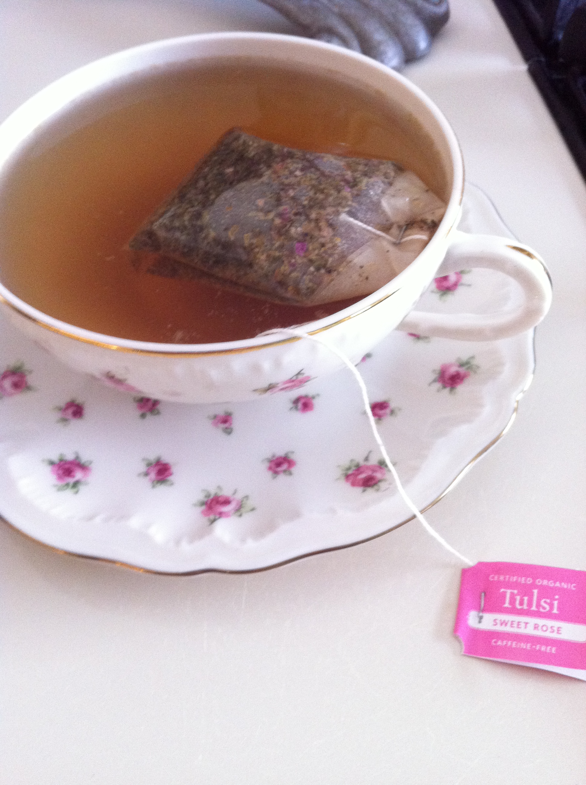 back inside, a hot cup of Tulsi rose