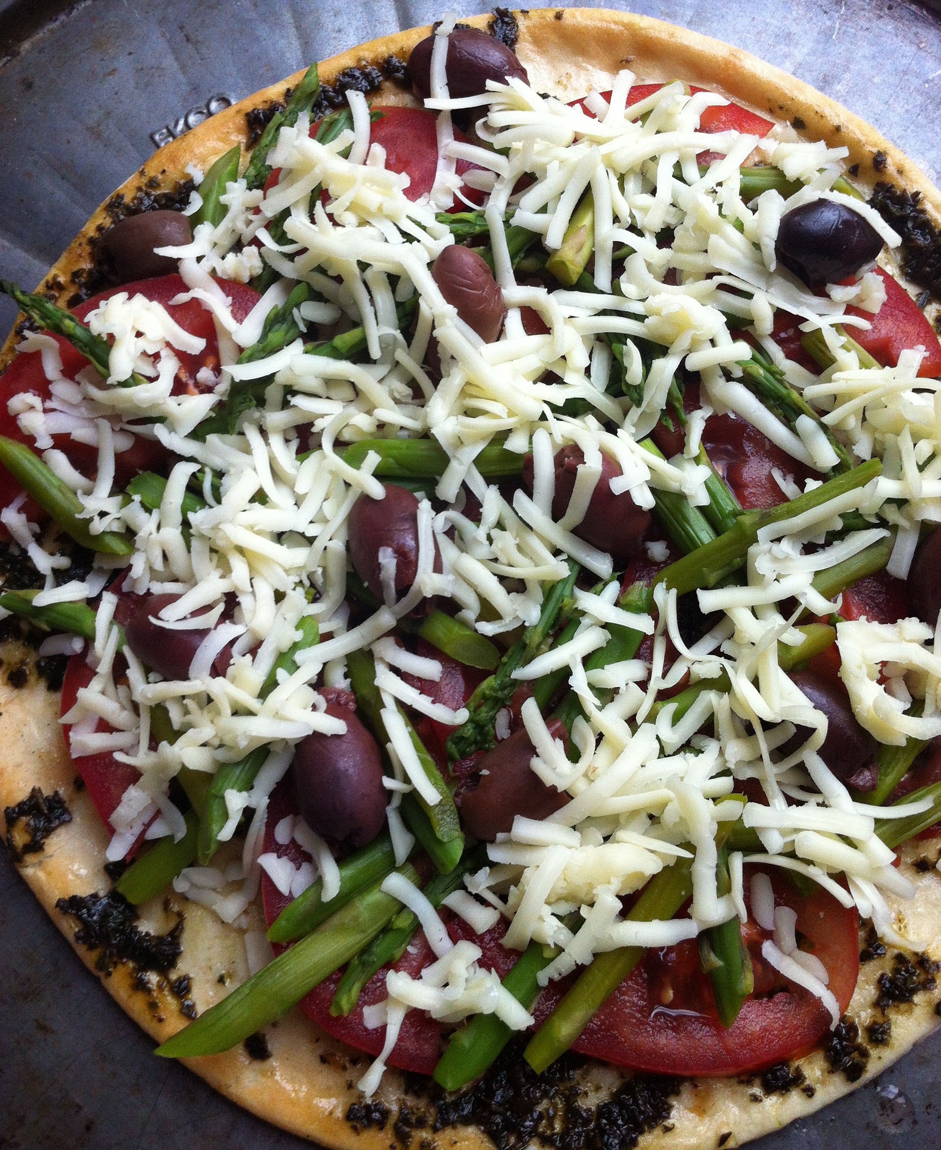 Smear the pizza crust with pesto. Add the tomato slices, asparagus, scatter the olives, and the shredded Fontina cheese. Grill the pizza, covered, just until the cheese melts and the crust is lightly browned.