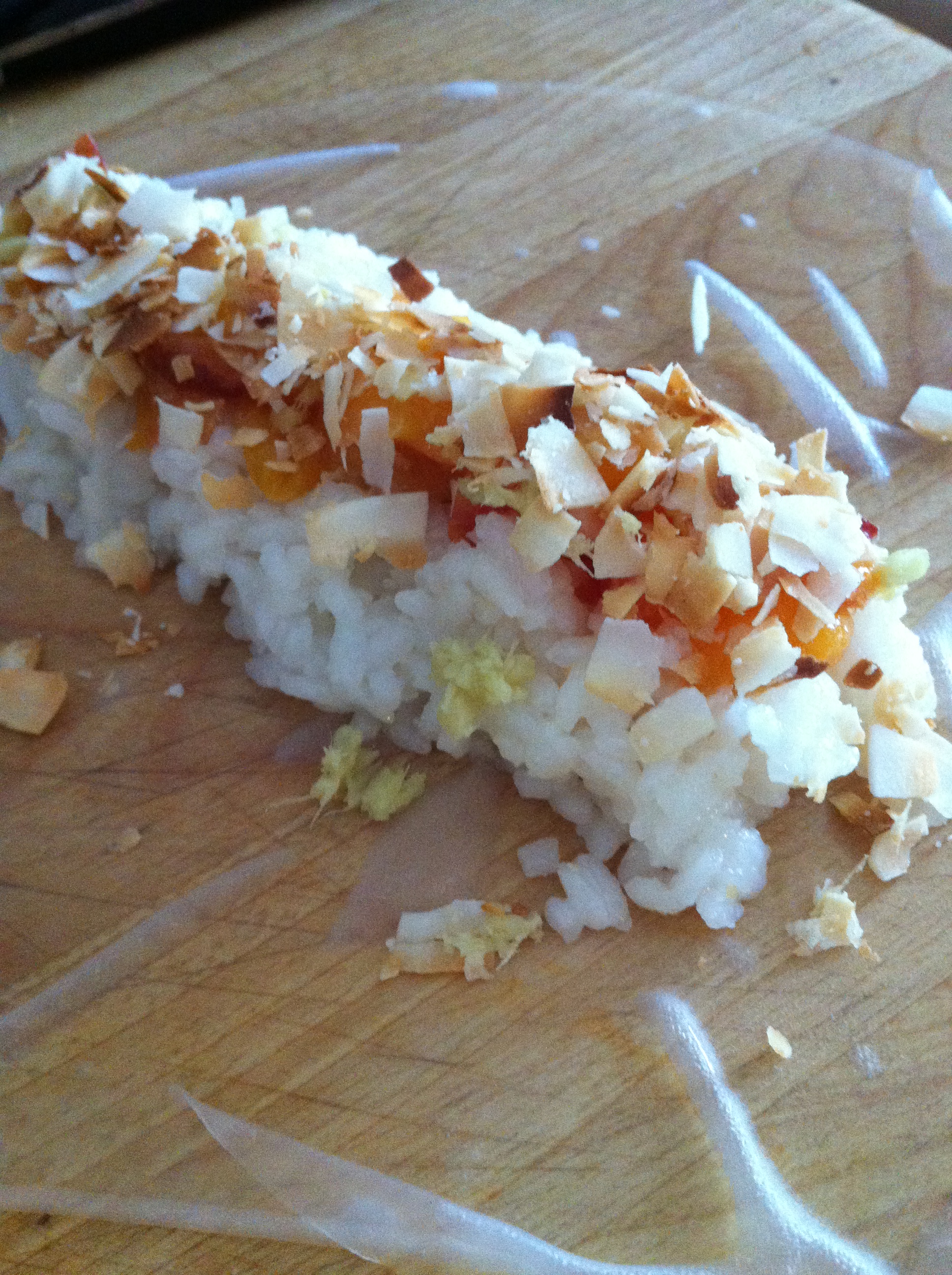 the innards – coconut rice, peaches, fresh ginger and toasted coconut