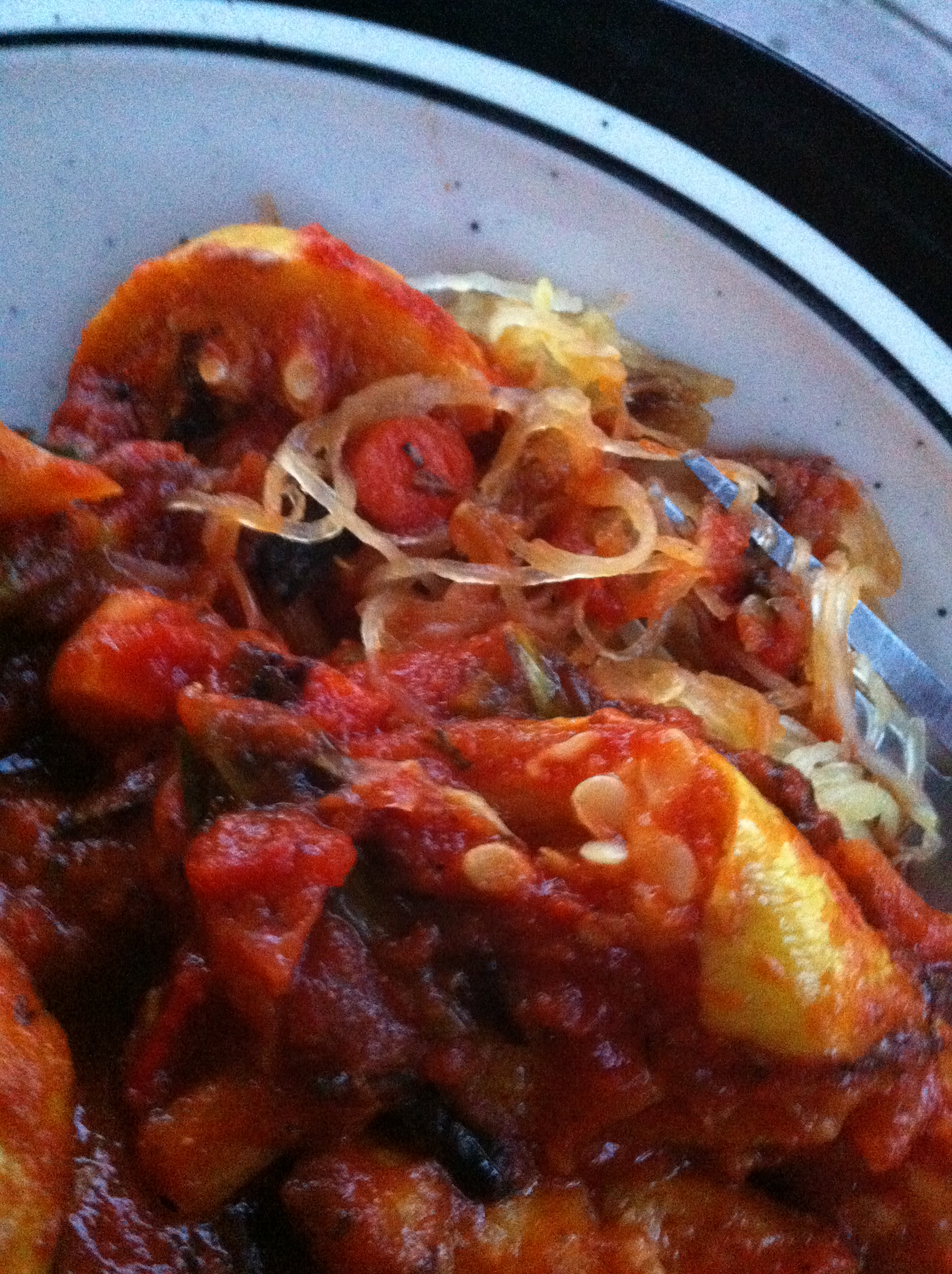So, voila – over a spoonful or two of the scooped out of the shell, grilled spaghetti squash, along with a wee bit more wine and a nice seat on the balcony –