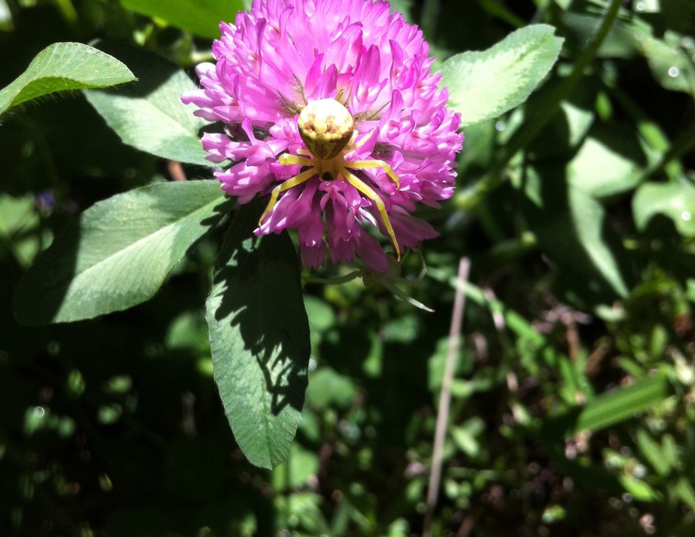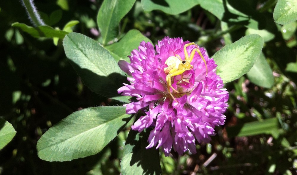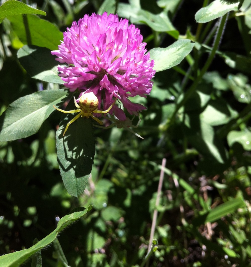 This morning I stepped out into the gardens early, with the cool wet grass under my feet. I have felt so grateful to have lived in this beautiful space. And to where I am going. This process of completing and beginning again, it happens daily. I felt so blessed to see the following visuals, now captured on film, take place in a few seconds. It is these moments that last, in my heart. My eye saw the spider – perhaps a type of crab spider, as my casual research suggests. In a few seconds, as I snapped, the spider (with it’s companion, as you look closely may see in a few of the photos) made it’s way quickly from red clover blossom to a leaf, in my front yard.