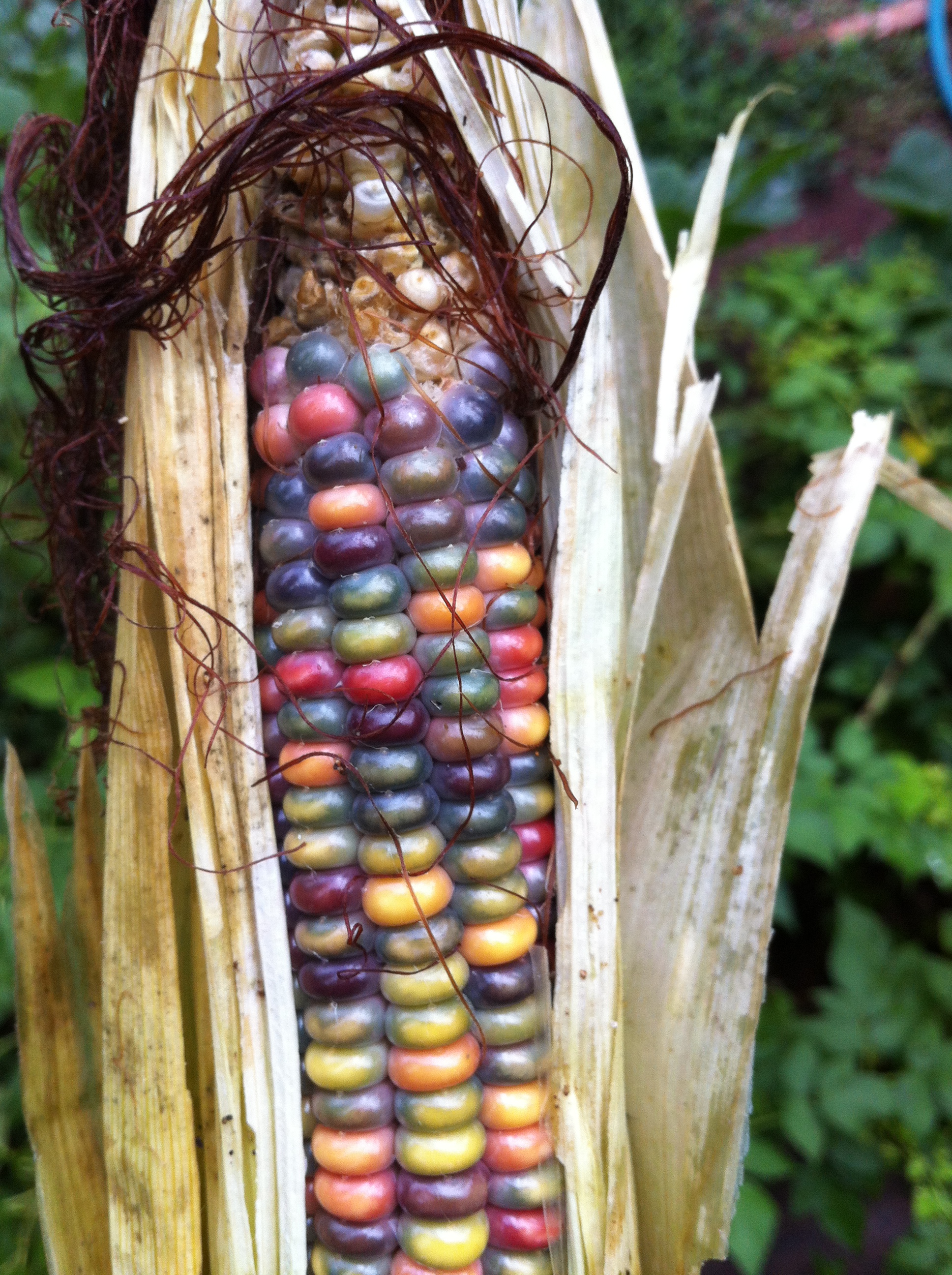 For me, and for many others growing this exquisite variety of corn, it seems magic. It glows like strings of tiny lights along the slender cobs!  We will be experimenting with drying corn for popping, and grinding for cornmeal – thrilled for that adventure, I will be sure to share with you!  Then, some ears will make their way into ceremonial use, and a few will decorate our doors this fall.