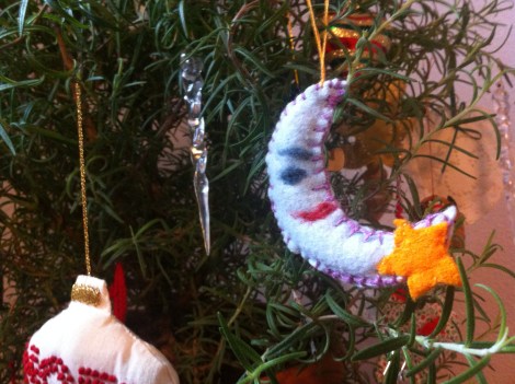 And had a sweet inspiration to decorate my 6 year old, impressively rotund rosemary bush for my yule tree this year. I dashed back and forth at whim from kitchen to living room, decorating, whisking chocolate, and – breathing in deeply now –