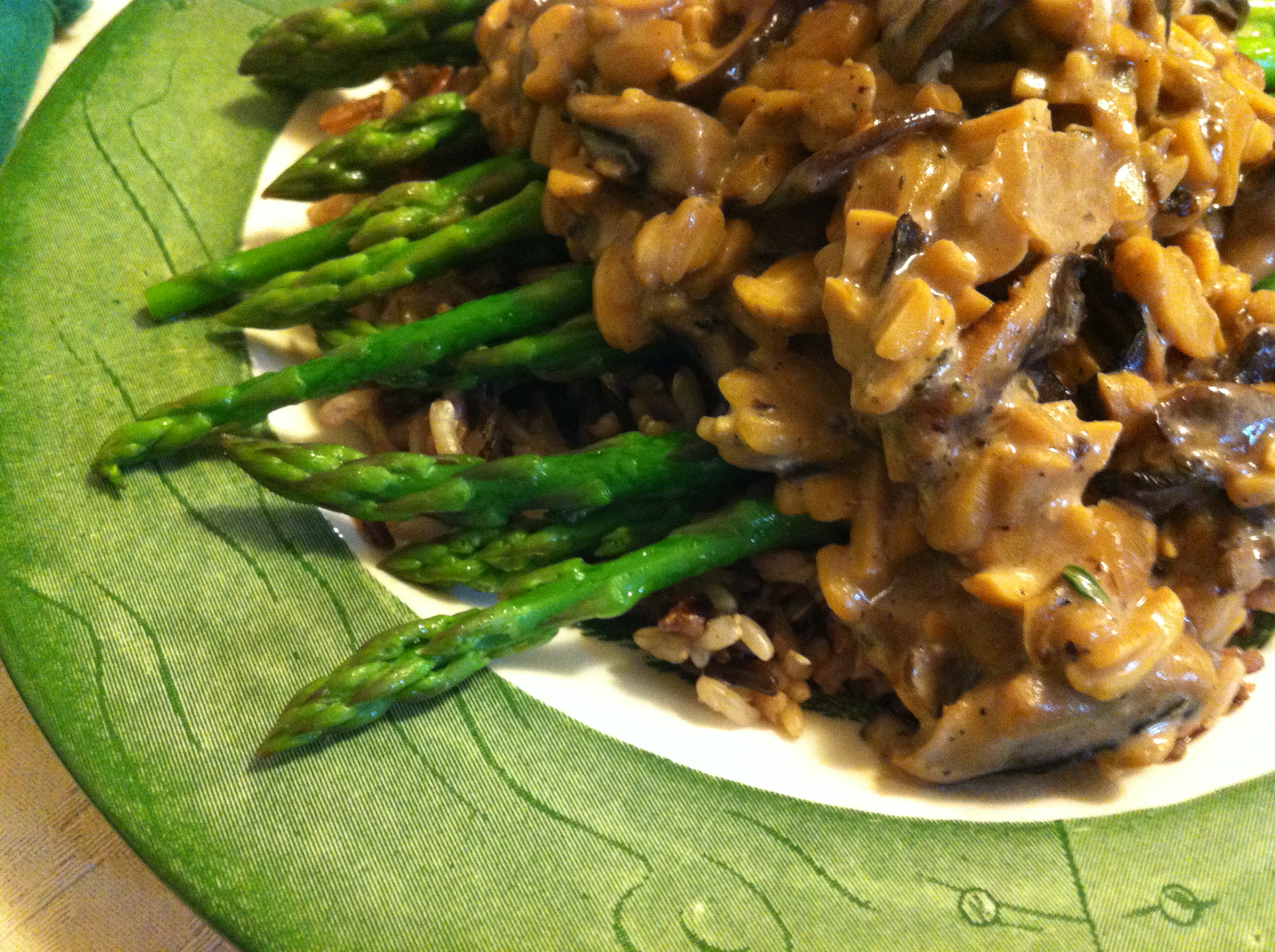 Pour in reserved mushroom cooking liquid, (or 1 1/2 c. water + 1/4 c. tamari,) tempeh and herbs and stir until well blended. Blend tapioca (or corn)starch with a few tablespoons of water and slowly stir into the stroganoff. Simmer until sauce has thickened, then add sour cream, blending well. Taste and adjust seasonings. Serve over wild rice blend or wide egg noodles. The asparagus was an inspiration when I saw it at the market today!