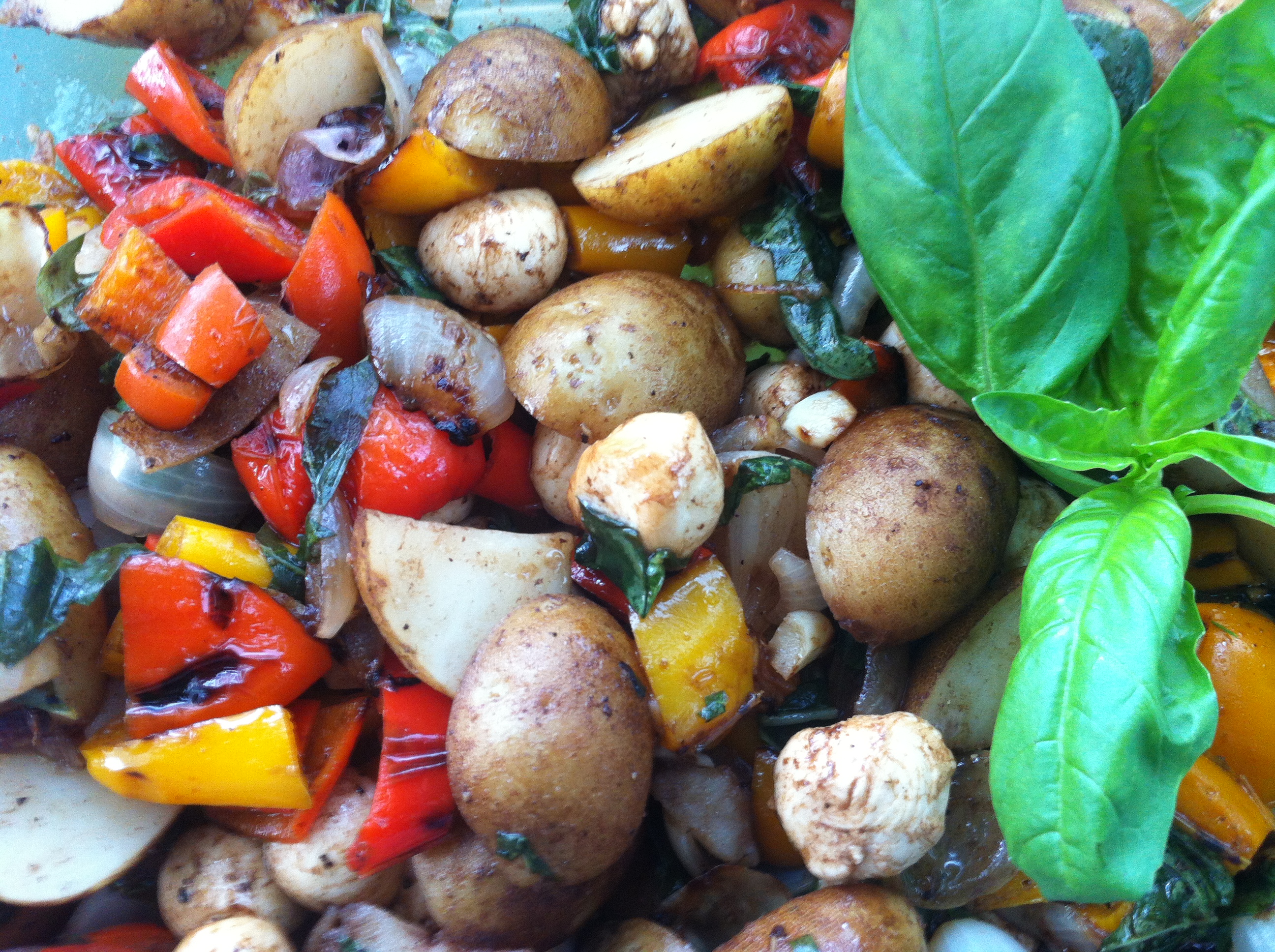 If necessary for size, halve or quarter the new potatoes. Steam or boil until quite tender, drain, and place in large bowl. Meanwhile, clean and halve or quarter onions, stem, halve and seed peppers, clean garlic cloves and leave whole. Grill onions, peppers and garlic, cool slightly, and roughly chop as desired. Add to the potatoes, along with pearl mozzarella. Roughly chop basil and add in to the bowl. In a separate small bowl, whisk balsamic vinegar while drizzling olive oil in. Add pepper and salt, and a bit of mustard if desired. Pour over salad and stir to blend. Delightful while still warm, as the mozzarella softens and the roast peppers are at peak flavor. Delicious refrigerated overnight as well. Lovely for picnics or outdoor dining as outdoor temperatures do not quickly spoil the salad.