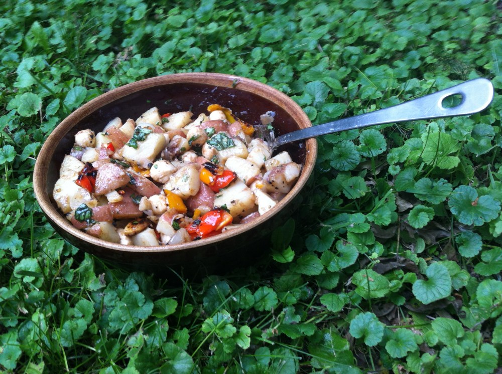 I happily made use of some of the Spuds of Joy I harvested after the intense hail then plant die-off a few weeks ago, some of them about as big as the “pearls” of mozzarella! I don’t measure exactly for a recipe like this, so I offer it to you in the free flowing style typically used in Pachamama’s happy kitchen…