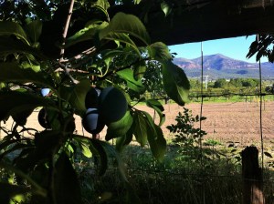 plum tree in the side yard with the orchard and mountains beyond Posted by Margaret Gilfoyle on September 22, 2014September 22, 2014