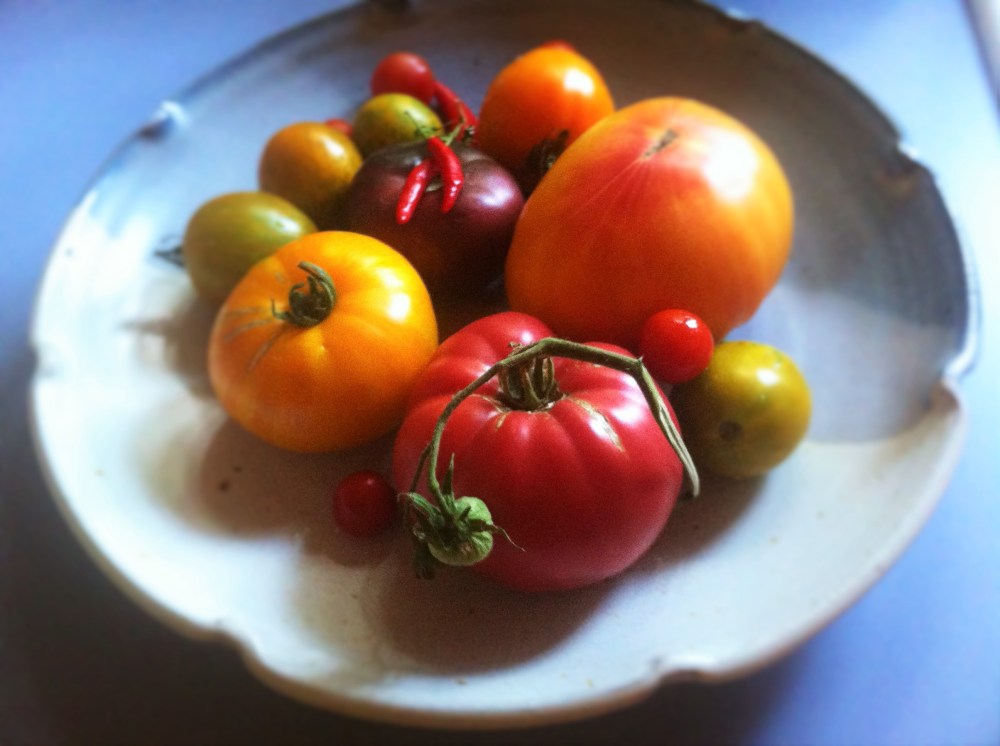 Recently, from my plants and from my CSA share, I happily, gratefully gleaned purple Cherokees, Valencias, Green Zebras, Sweet 100’s, old-fashioned cherry, pink brandywine, German striped and sungold tomato varieties.