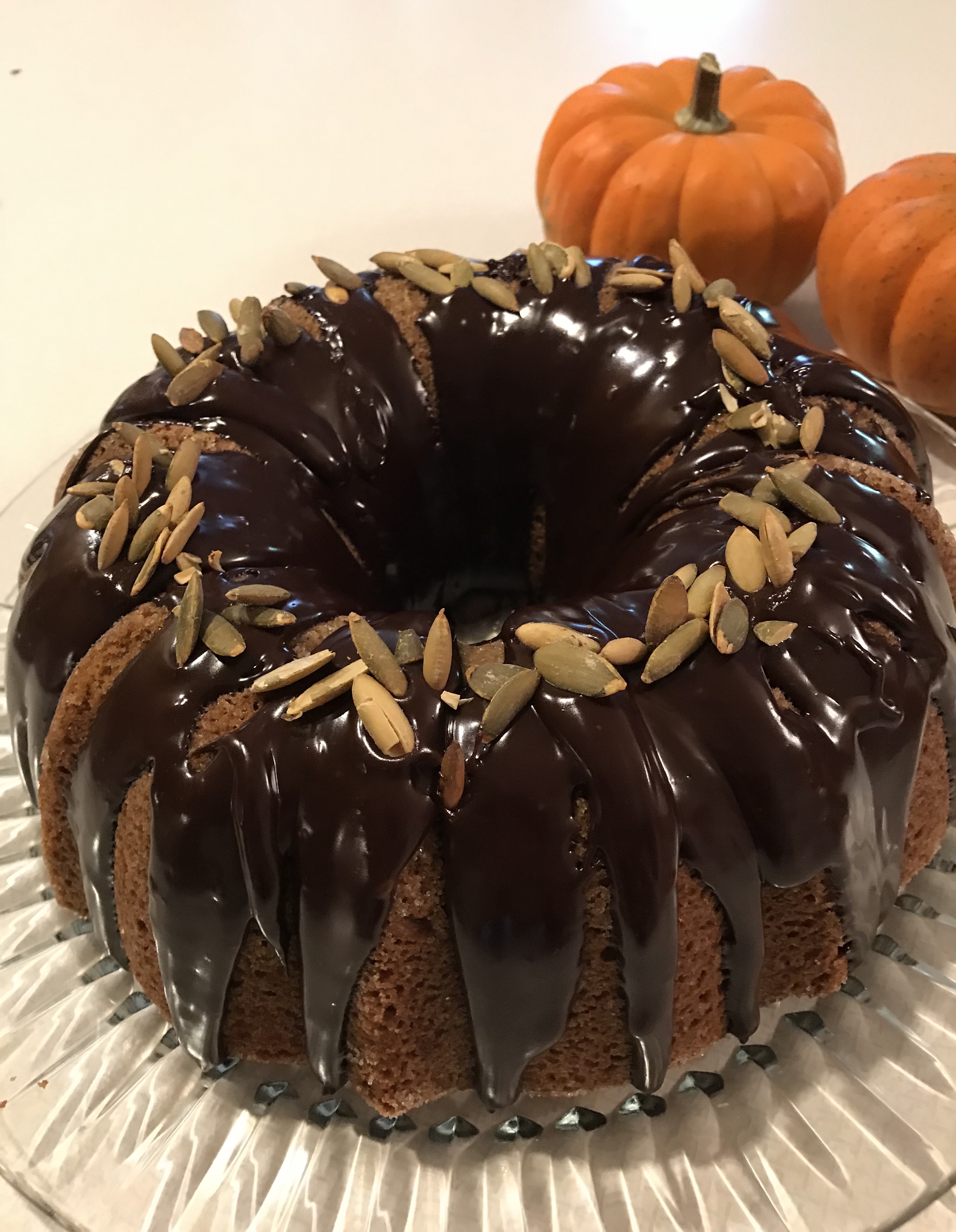 Scrumptious GF pumpkin cake with chocolate ganache and salted pepitas