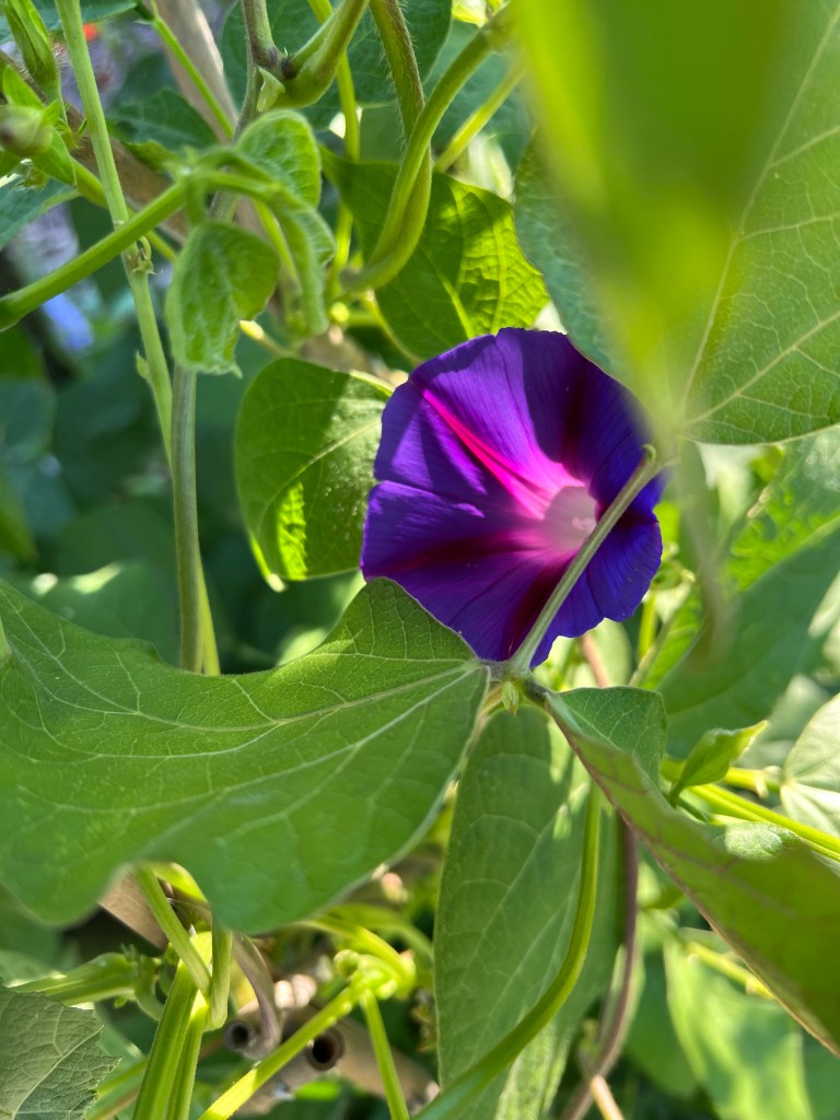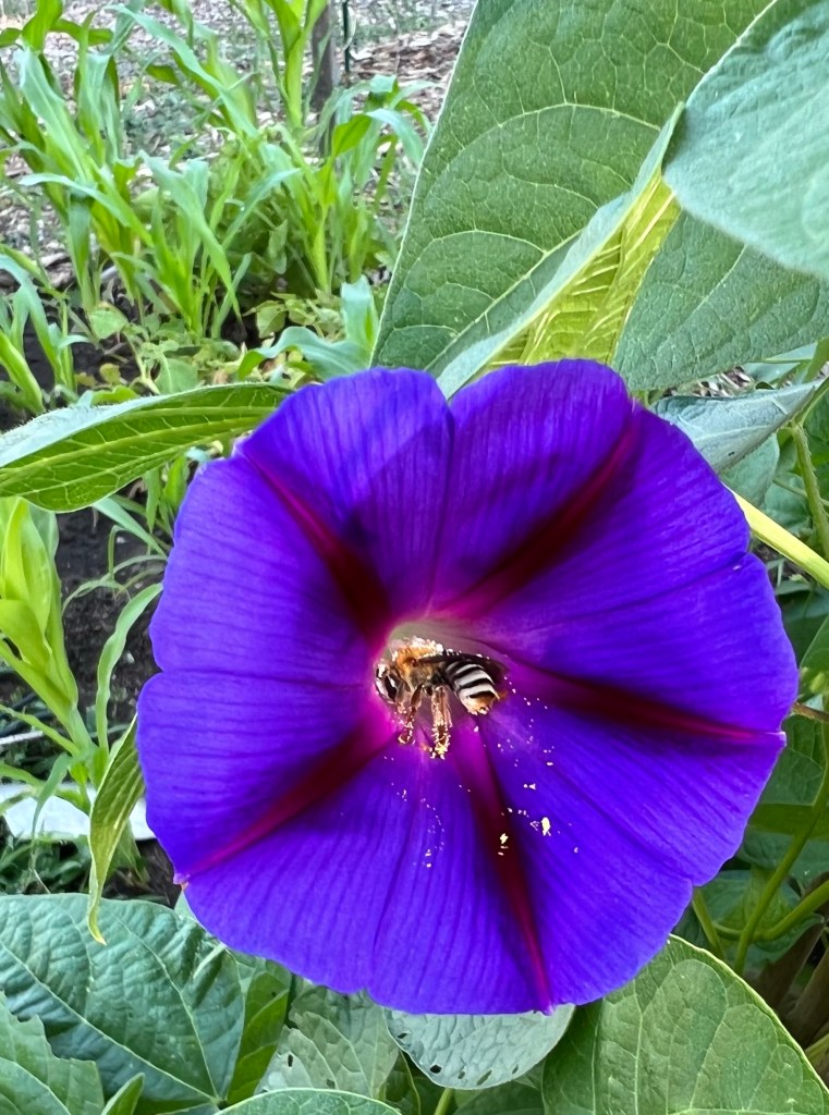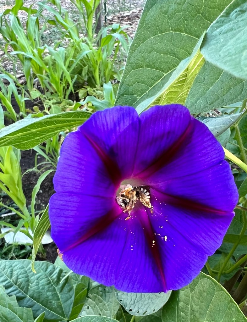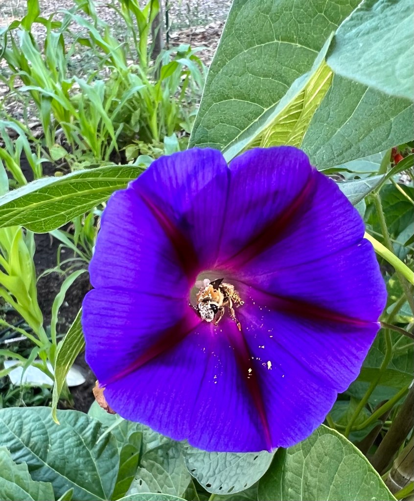 I was treated to this bee backing out and turning to fly from a glowing Grandpa Ott’s morning glory flower, fully loaded with pollen.