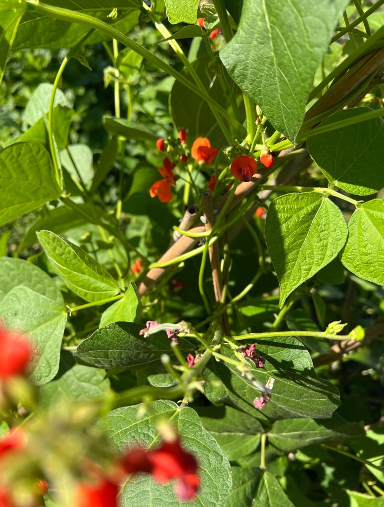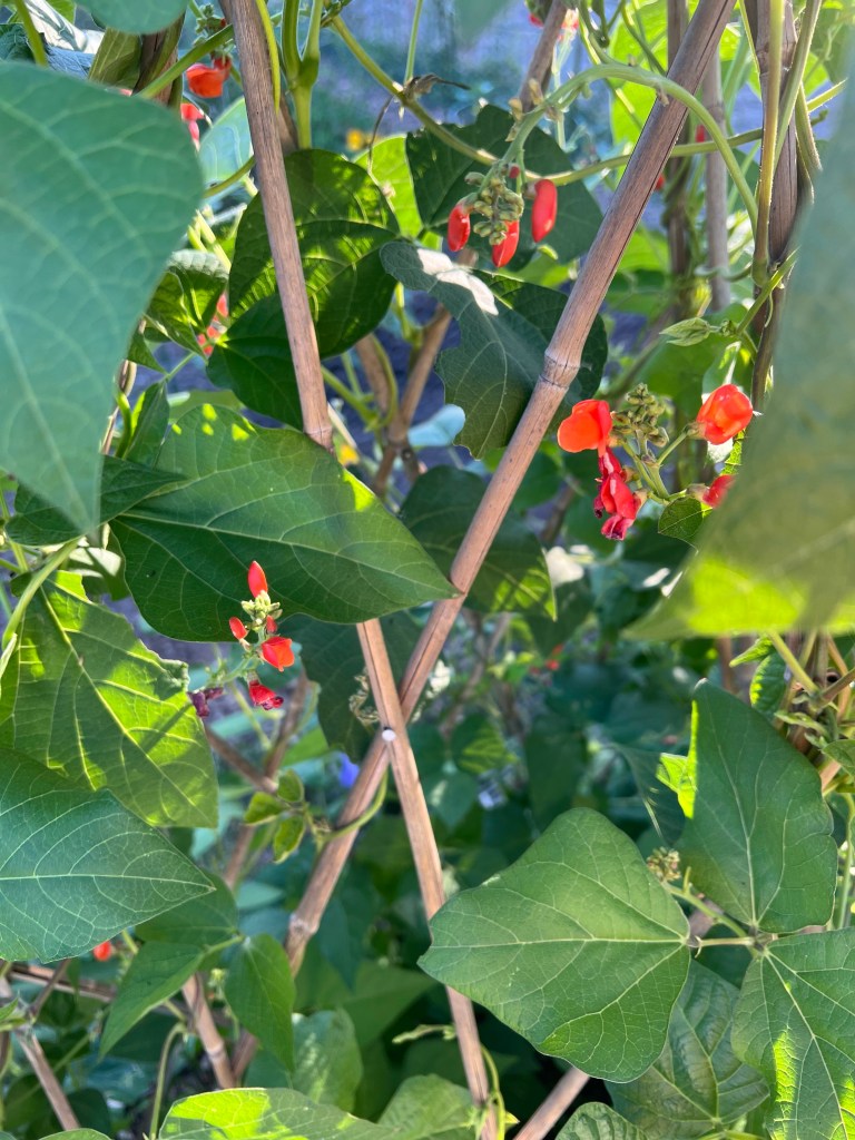 Scarlet emperor bean flowers sparking amongst the green vine covered tipi