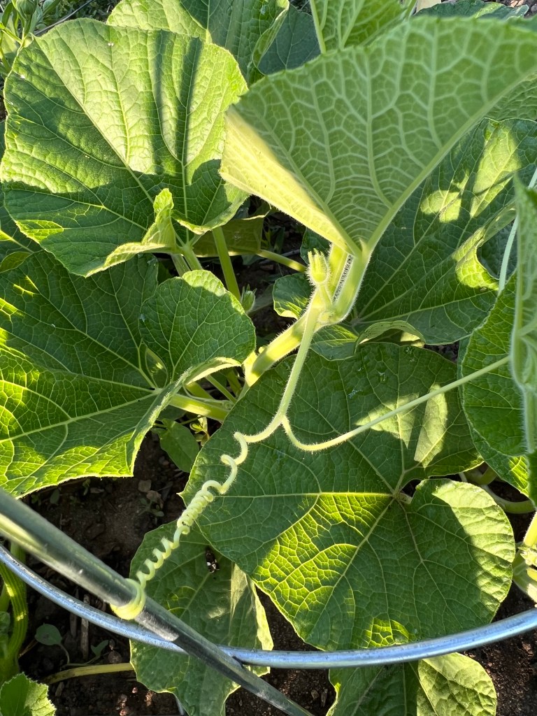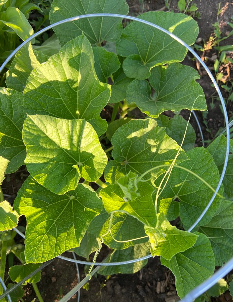 Ruffly red kuri squash flowers and exquisite light through the leaves